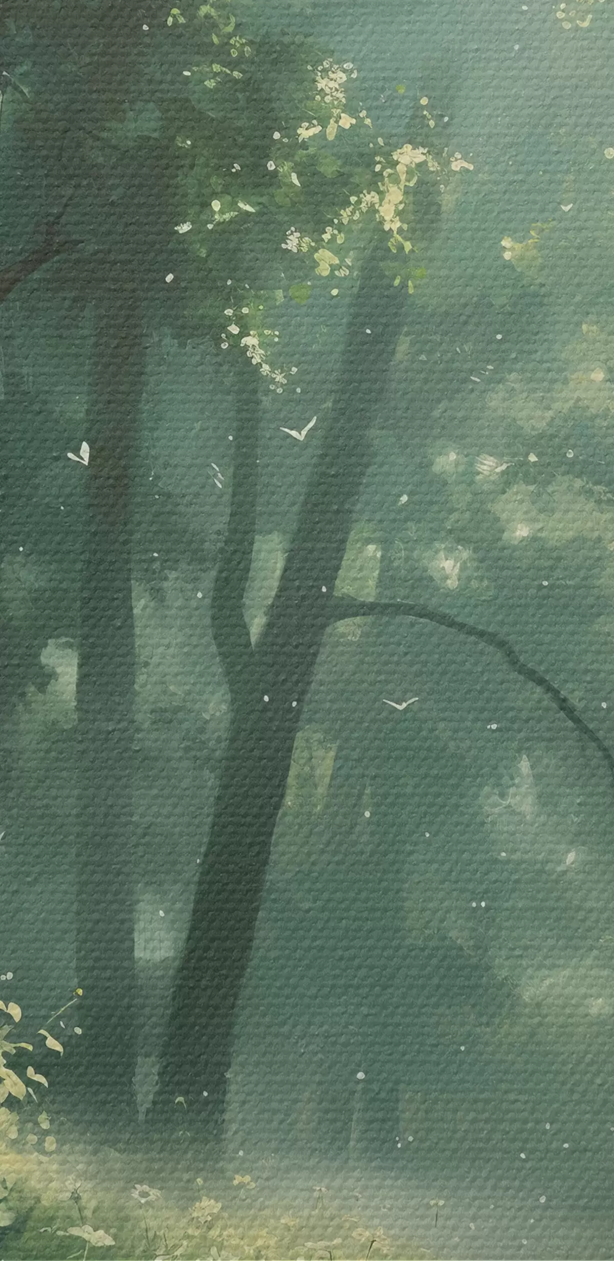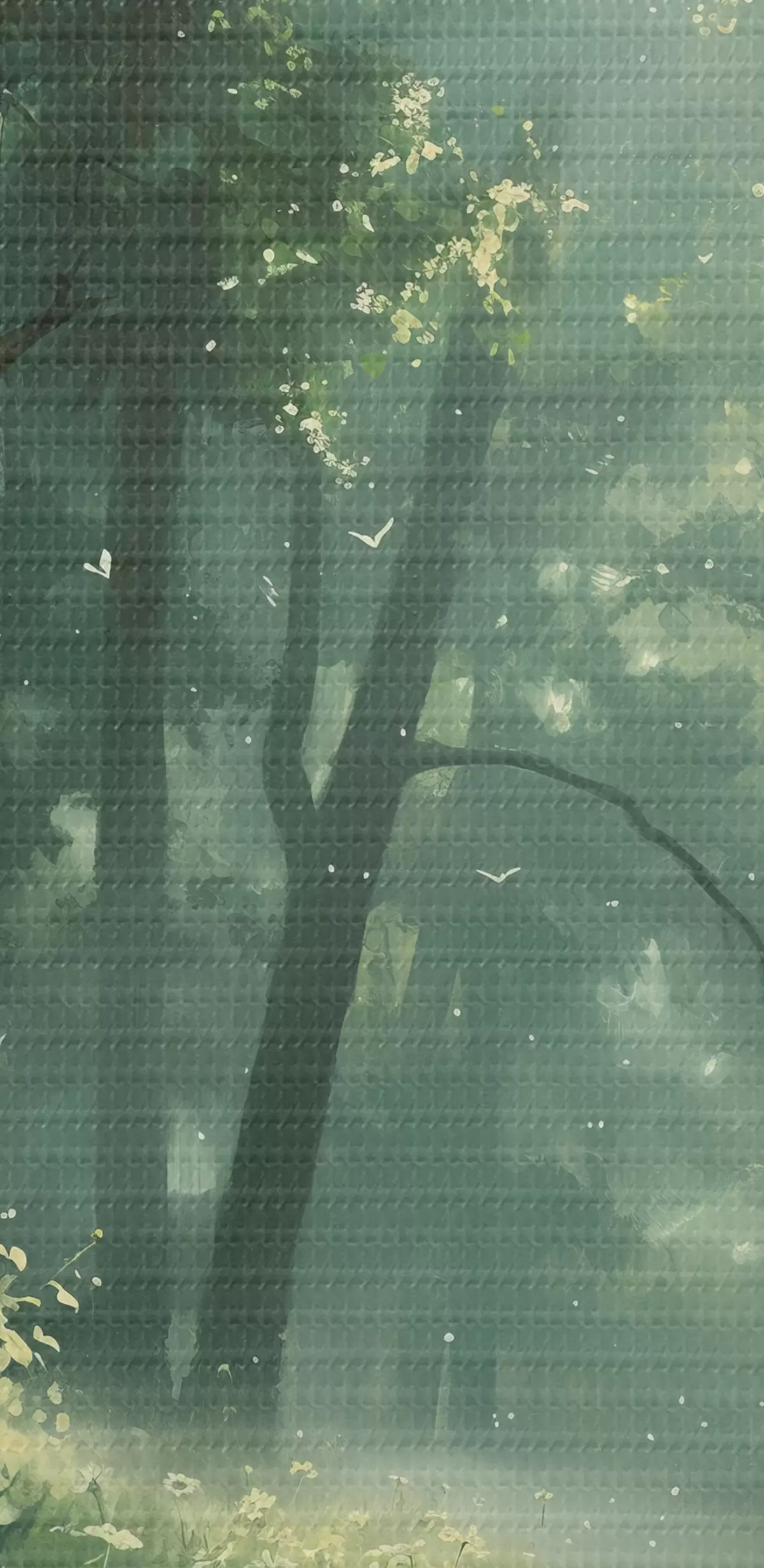 Cuadros Bosque denso con luz solar en los árboles, flores de manzanilla, hierba verde, naturaleza. Nr s40224