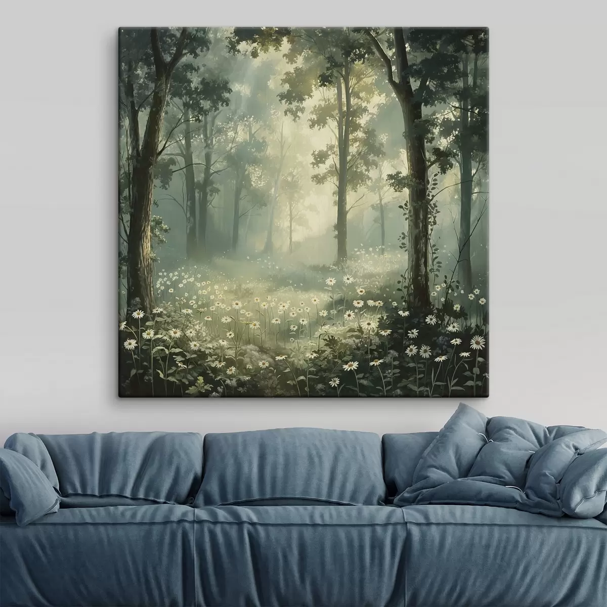 Cuadros Bosque con suave luz solar, flores de manzanilla, árboles, hierba verde, dibujo acrílico. Nr s40228