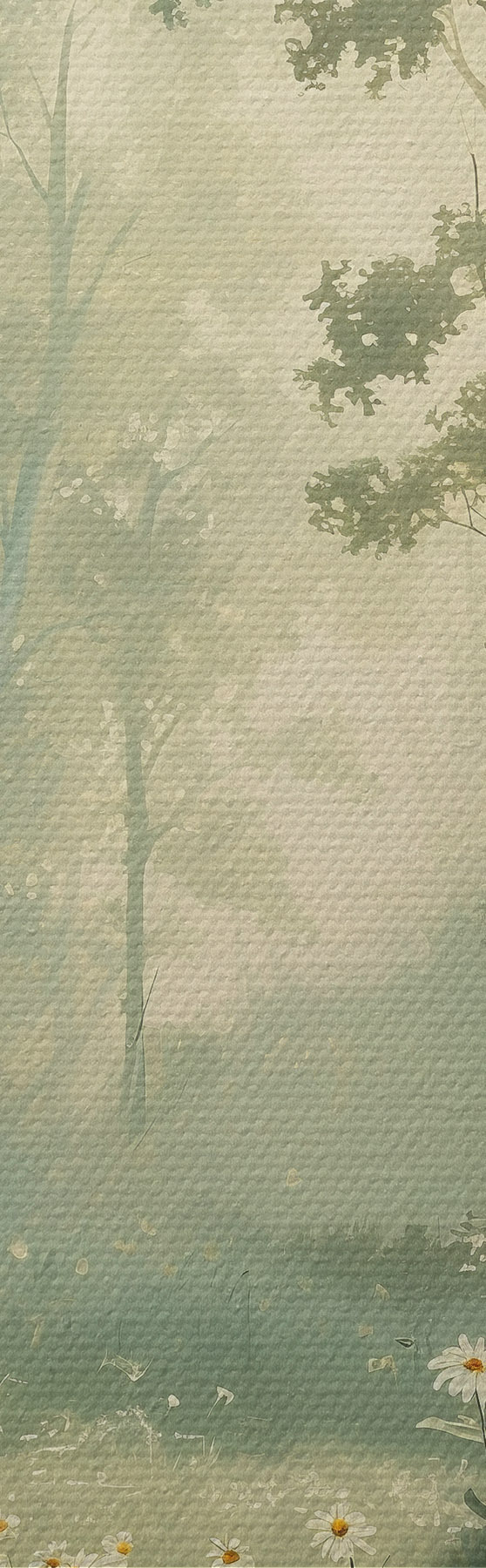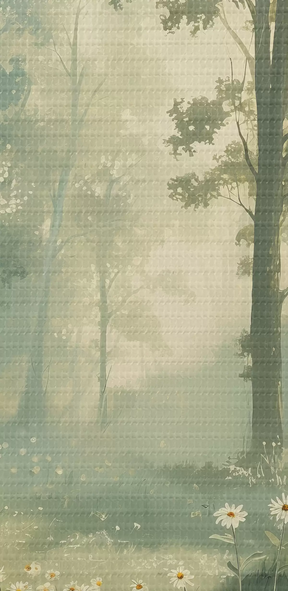murales de pared Bosque con suave luz solar, flores de manzanilla, árboles, hierba verde, dibujo acrílico. s40228