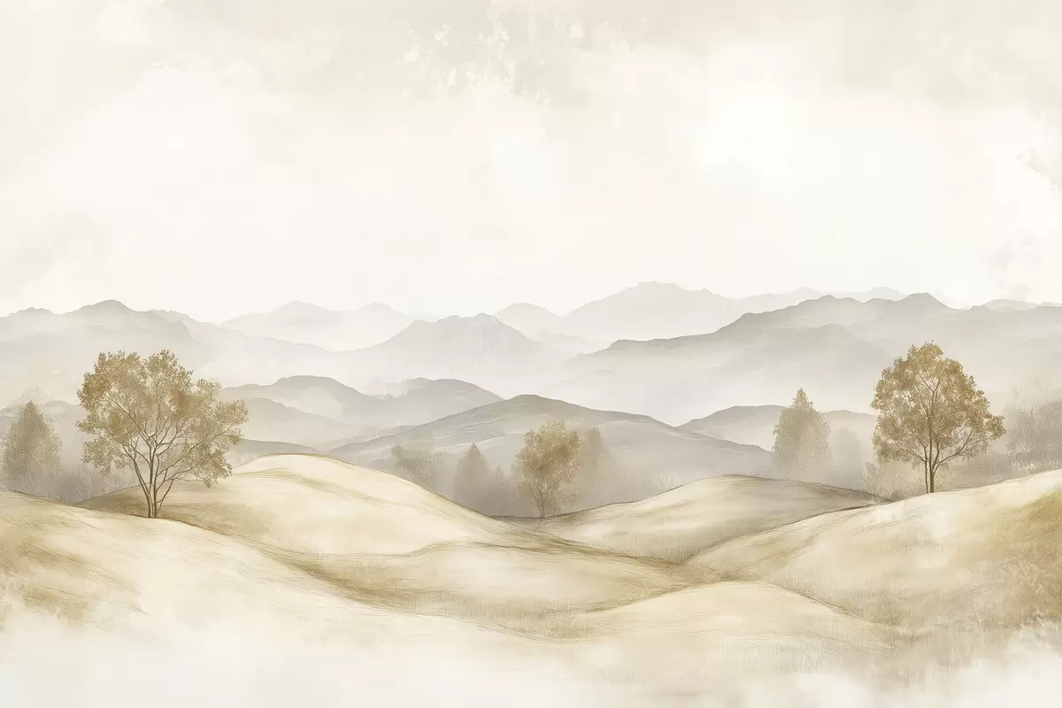 murales de pared Paisaje natural en paleta de colores beige, prado, árboles, dibujo de acuarela. s40231