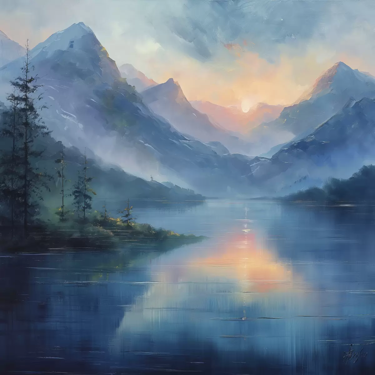 Cuadros Puesta de sol en las montañas, niebla, río, forеst, pintura al óleo Nr s40302
