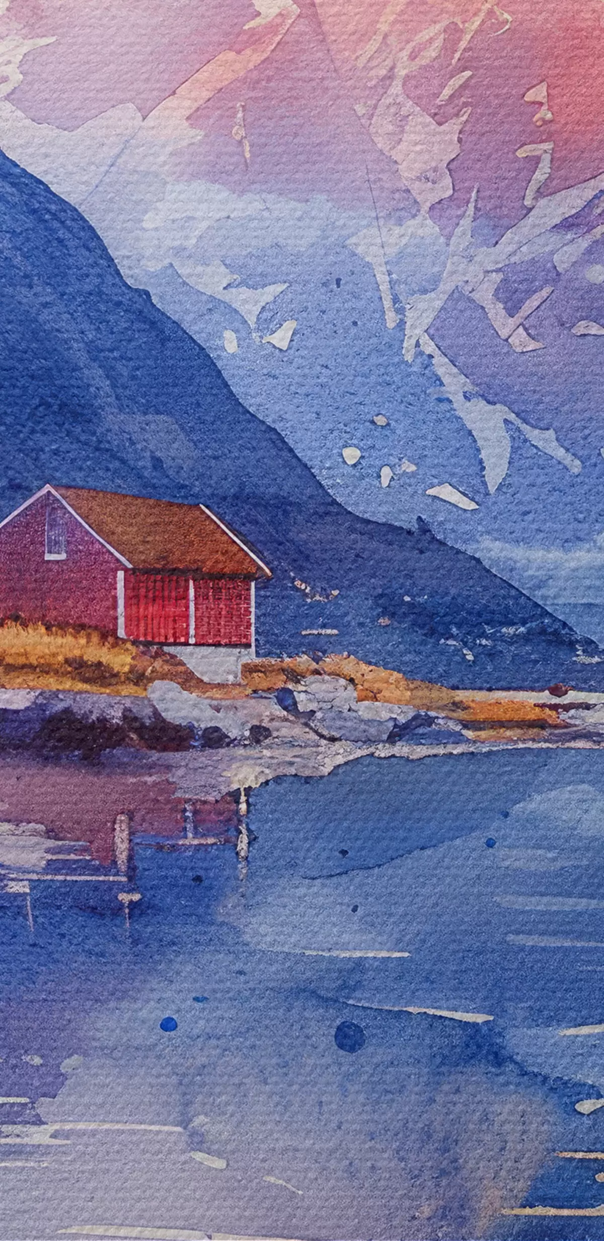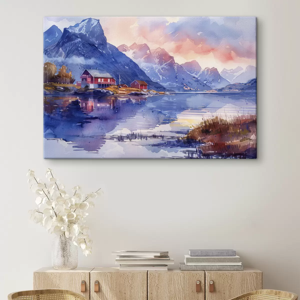 Cuadros Pueblo noruego, cielo al atardecer, río tranquilo, montañas, acuarela Nr s40311