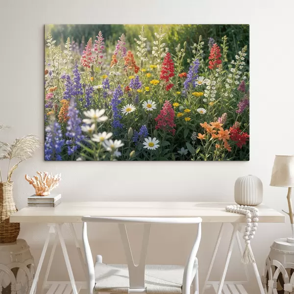 Cuadros Un prado colorido de flores silvestres con varias flores florecientes, incluidas margaritas, lavanda y flores rojas. Nr s40390