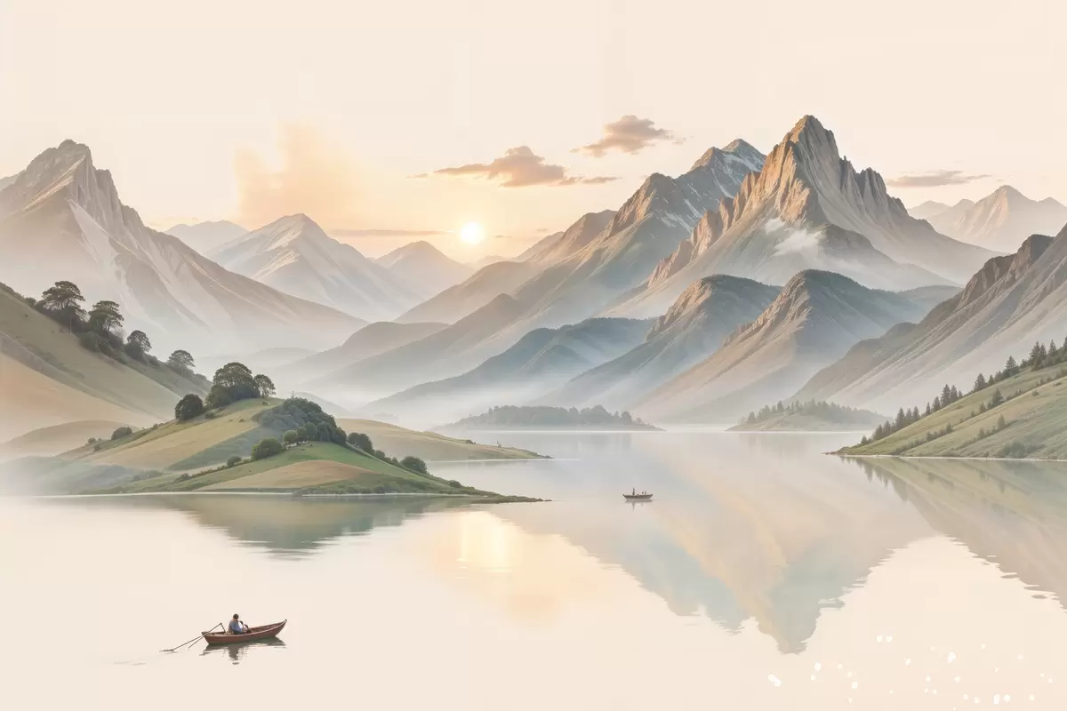 Cuadros Un paisaje sereno con un lago que refleja las montañas en el fondo con un pequeño bote en el agua tranquila. Nr s40391