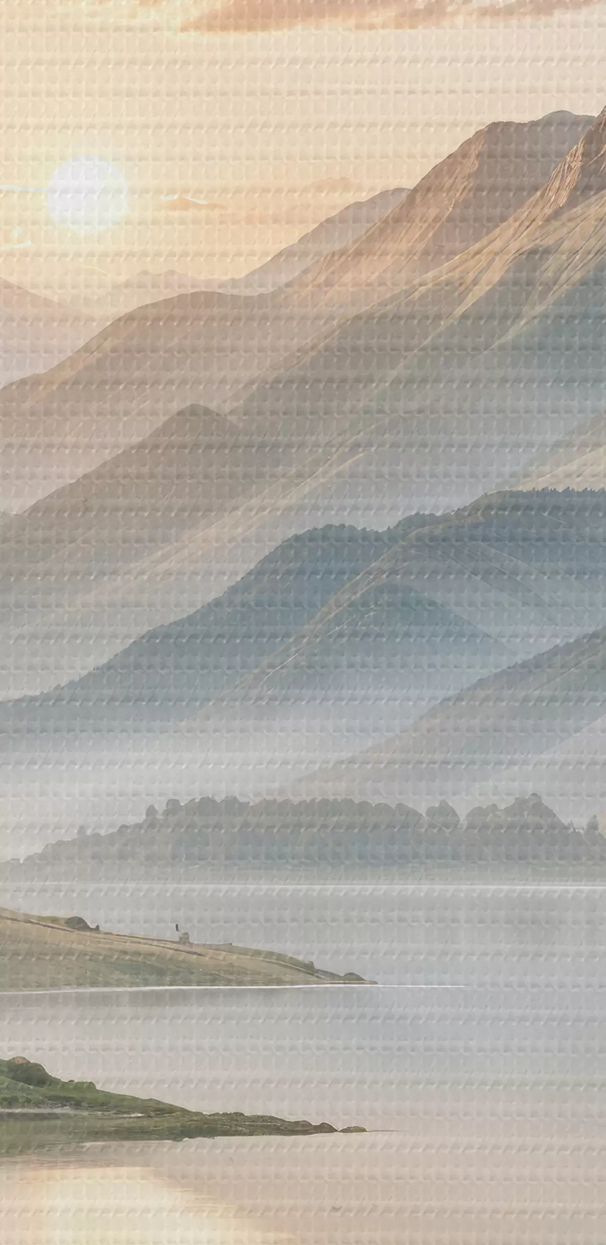 murales de pared Un paisaje sereno con un lago que refleja las montañas en el fondo con un pequeño bote en el agua tranquila. s40391