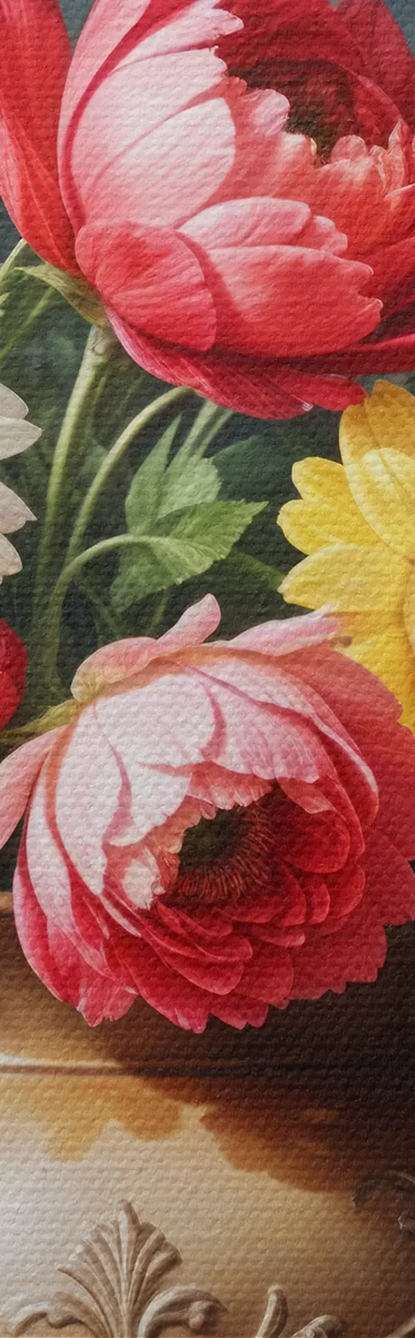 Hay tres tipos de material disponibles para pedidos: Lienzo Económico - material denso y duradero para impresión digital, idéntico al lienzo de pintor, superficie impermeable, reproducción realista de los detalles, material de grano medio. Lienzo Premium - la textura se asemeja a la de un lienzo de pintor (pequeños hilos entrelazados). Reproducción suave y detallada de la imagen sobre una superficie mate. Eco-Premium - tejido 100% algodón de alta calidad. Gracias a las fibras naturales de algodón, el material es duradero y resistente al desgaste. Excelente reproducción del color y el detalle.