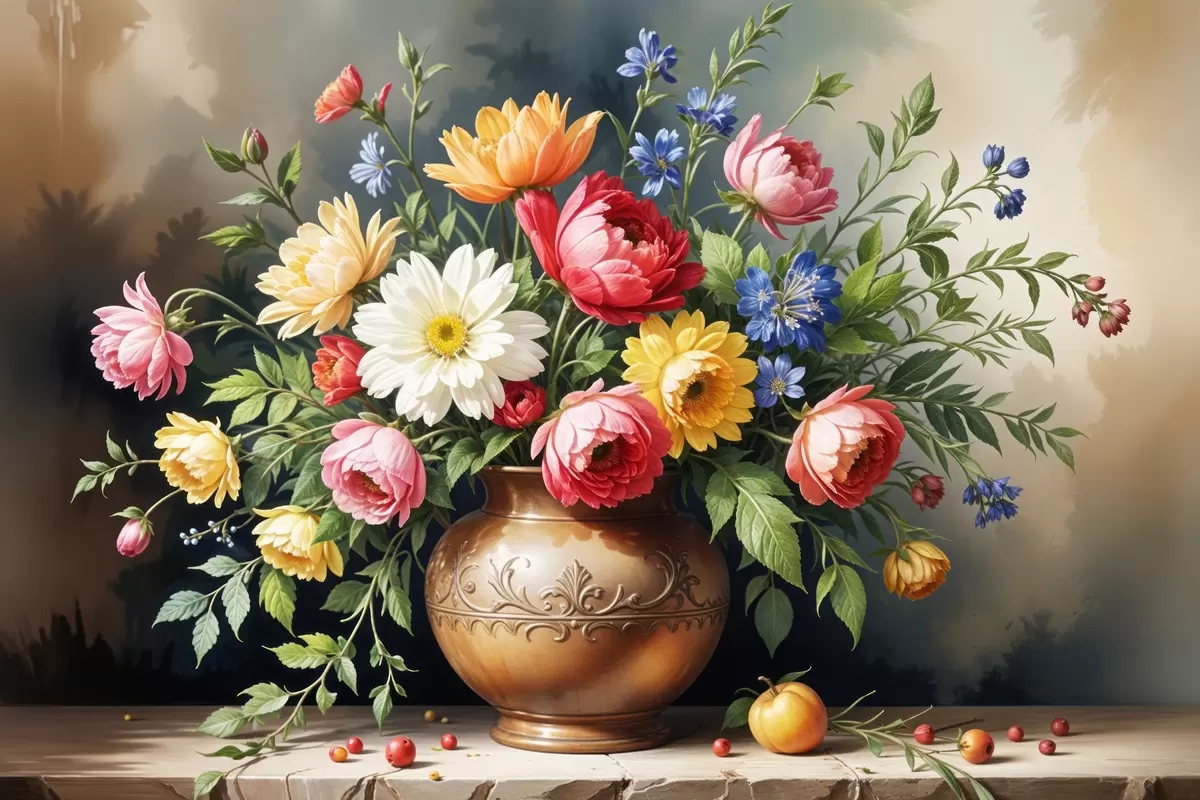 murales de pared Una pintura vibrante de un ramo de flores coloridas que incluye rosas rojas, narcisos amarillos y margaritas blancas.  s40395