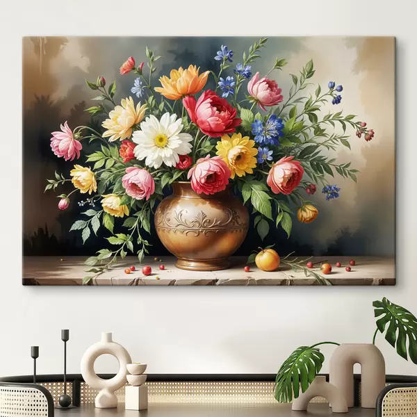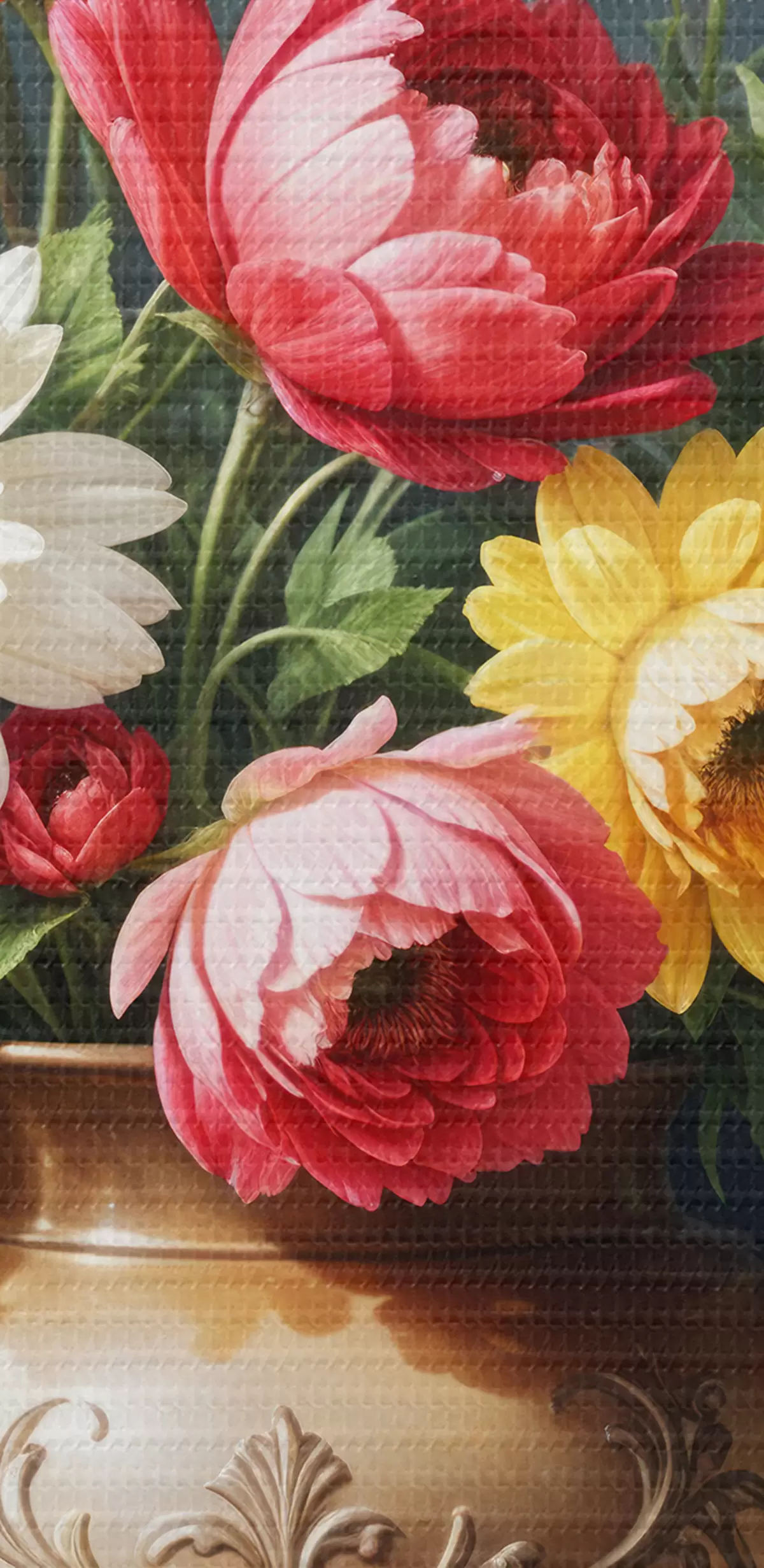 Cuadros Una pintura vibrante de un ramo de flores coloridas que incluye rosas rojas, narcisos amarillos y margaritas blancas. Nr s40395