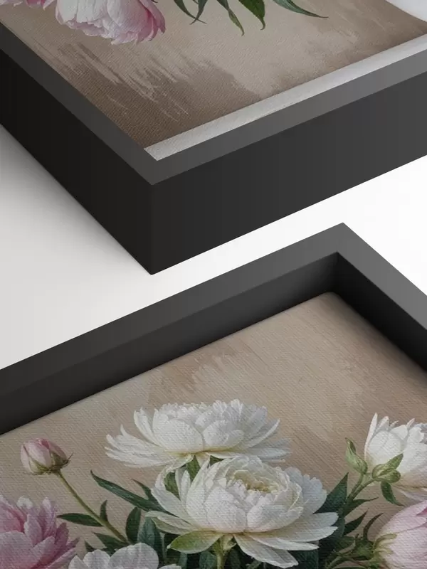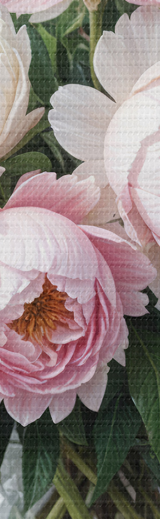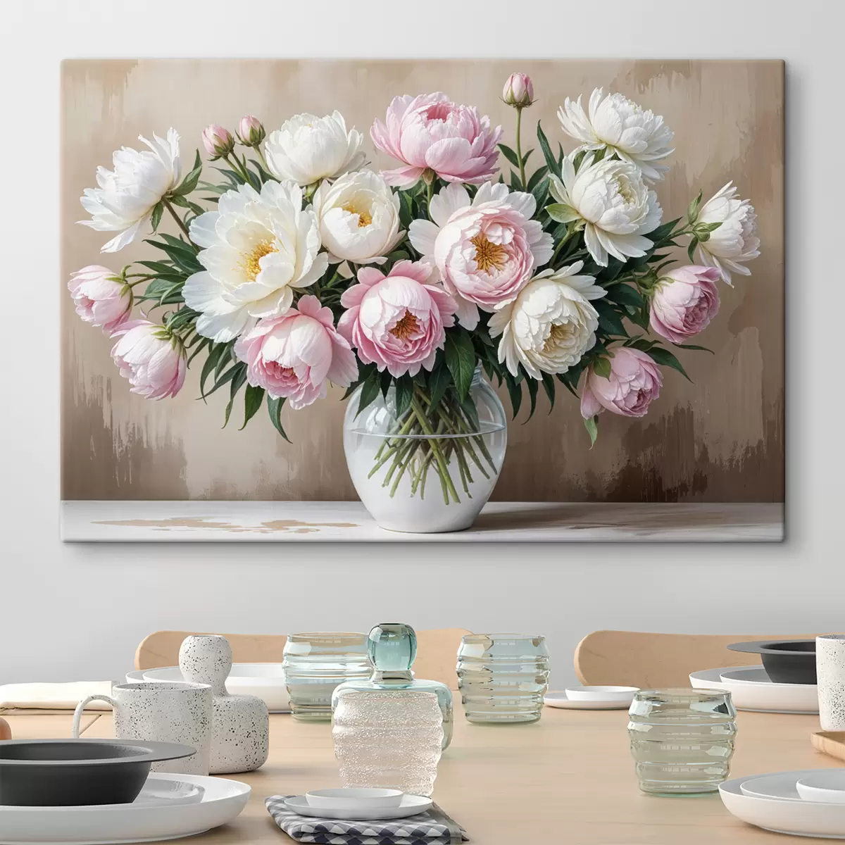 Cuadros Un ramo de hermosas peonías rosas y blancas en un jarrón de vidrio, dispuestas sobre una superficie de madera. Nr s40398