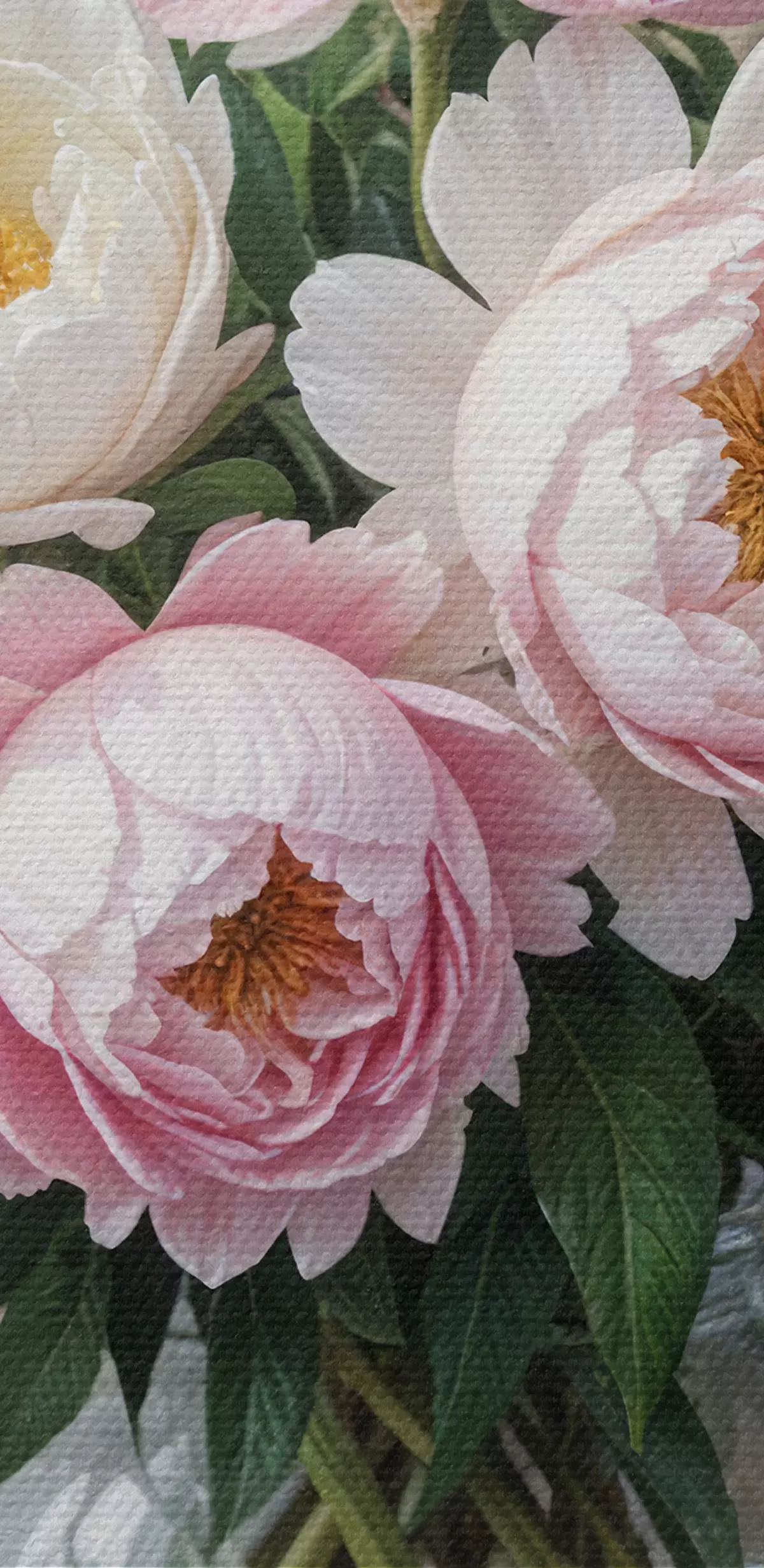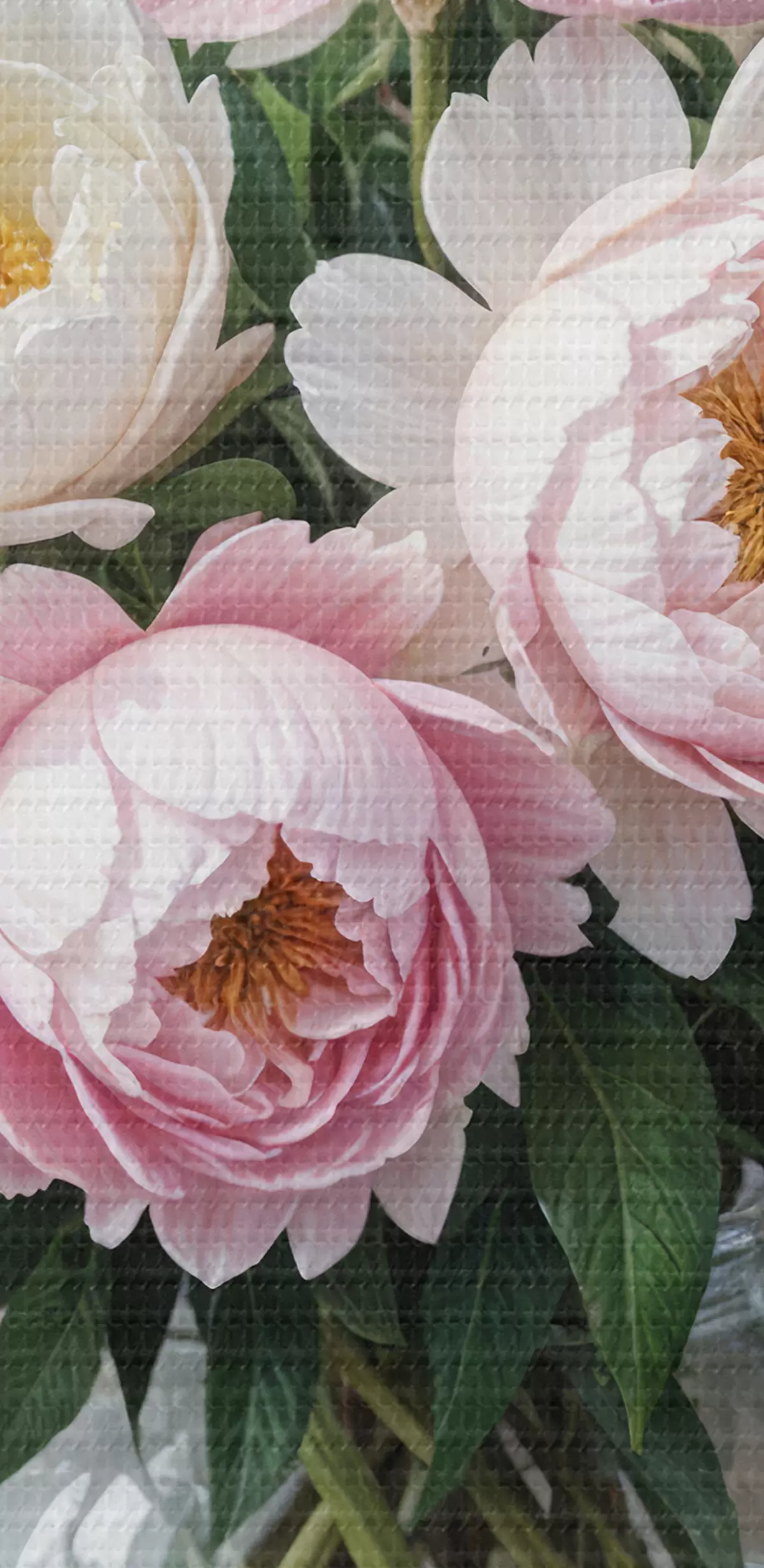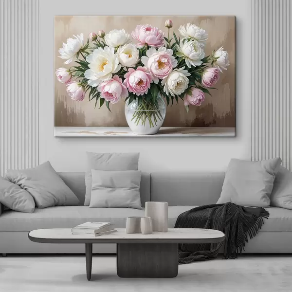 Cuadros Un ramo de hermosas peonías rosas y blancas en un jarrón de vidrio, dispuestas sobre una superficie de madera. Nr s40398