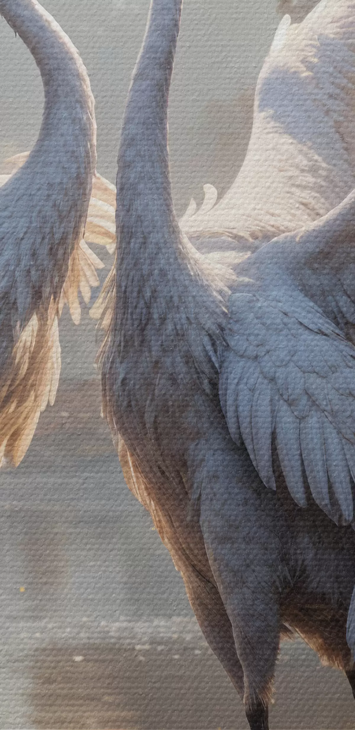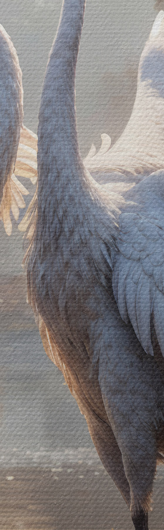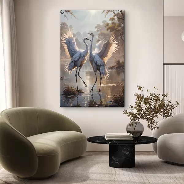 Cuadros Dos grandes grullas grises con cuellos largos y alas extendidas de pie en un lago brumoso rodeado de árboles. Nr s40404