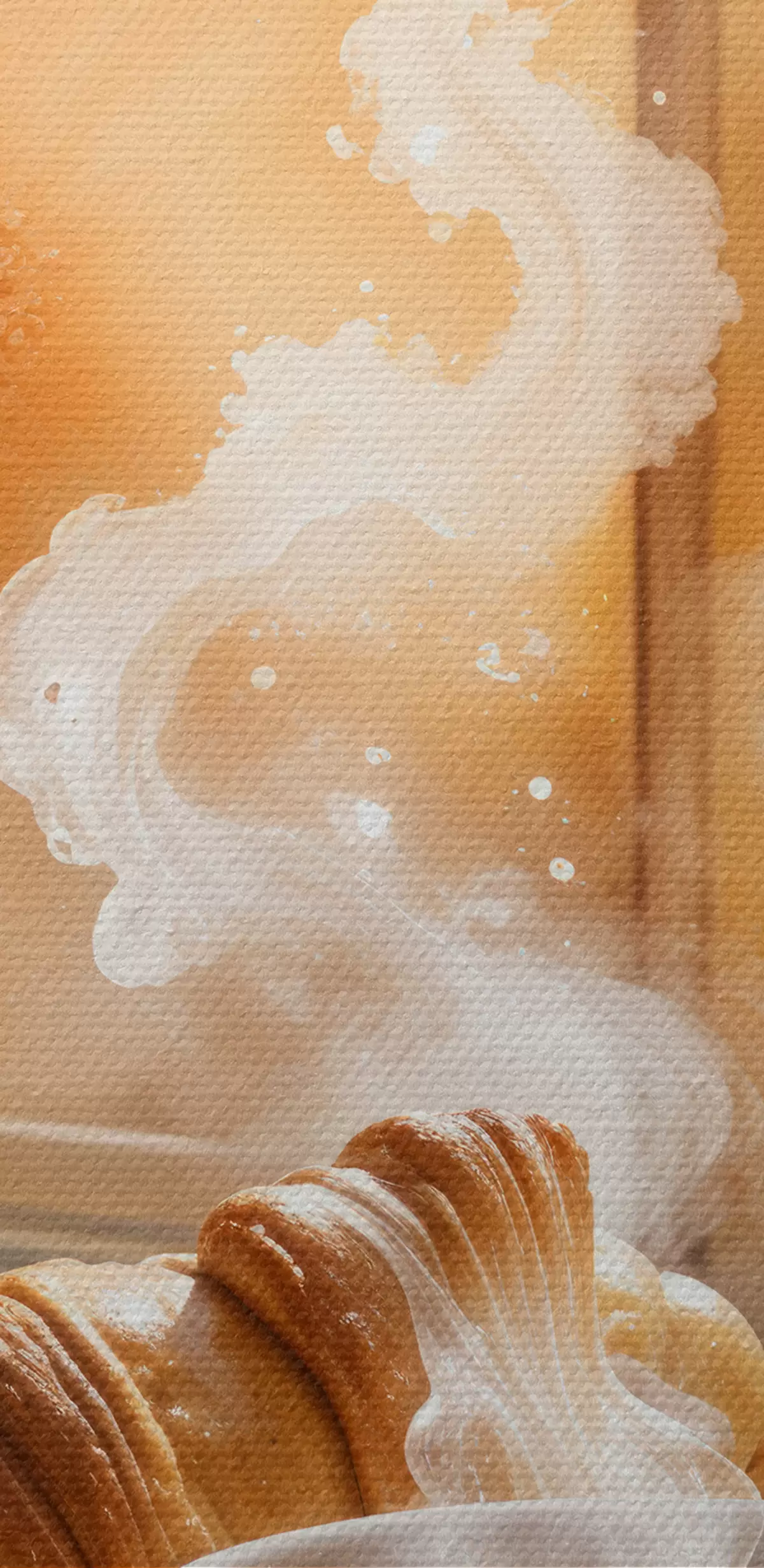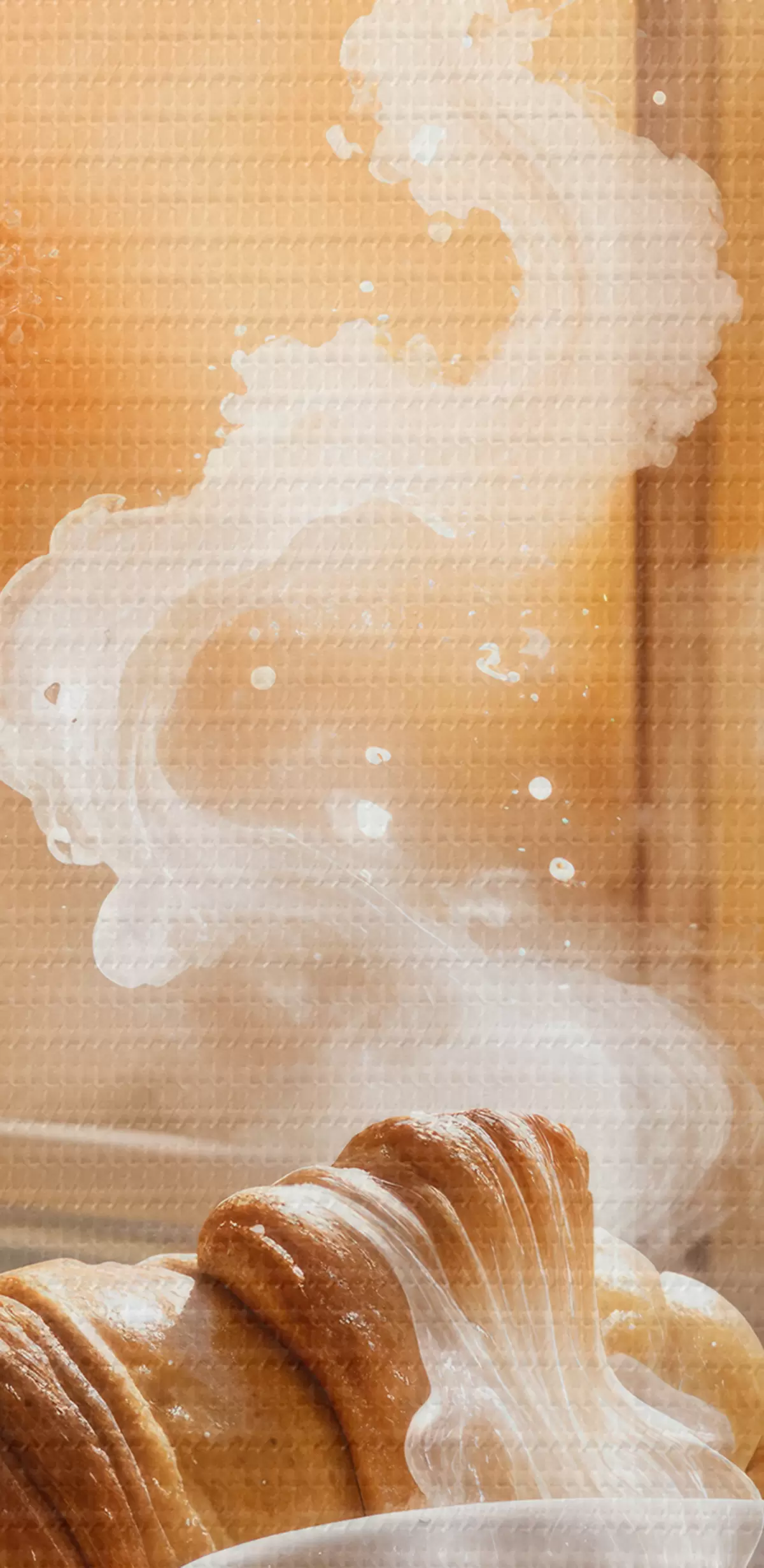 murales de pared Una taza de café caliente con vapor elevándose, colocada sobre una mesa junto a un croissant, con vista a un edificio histórico.  s40405