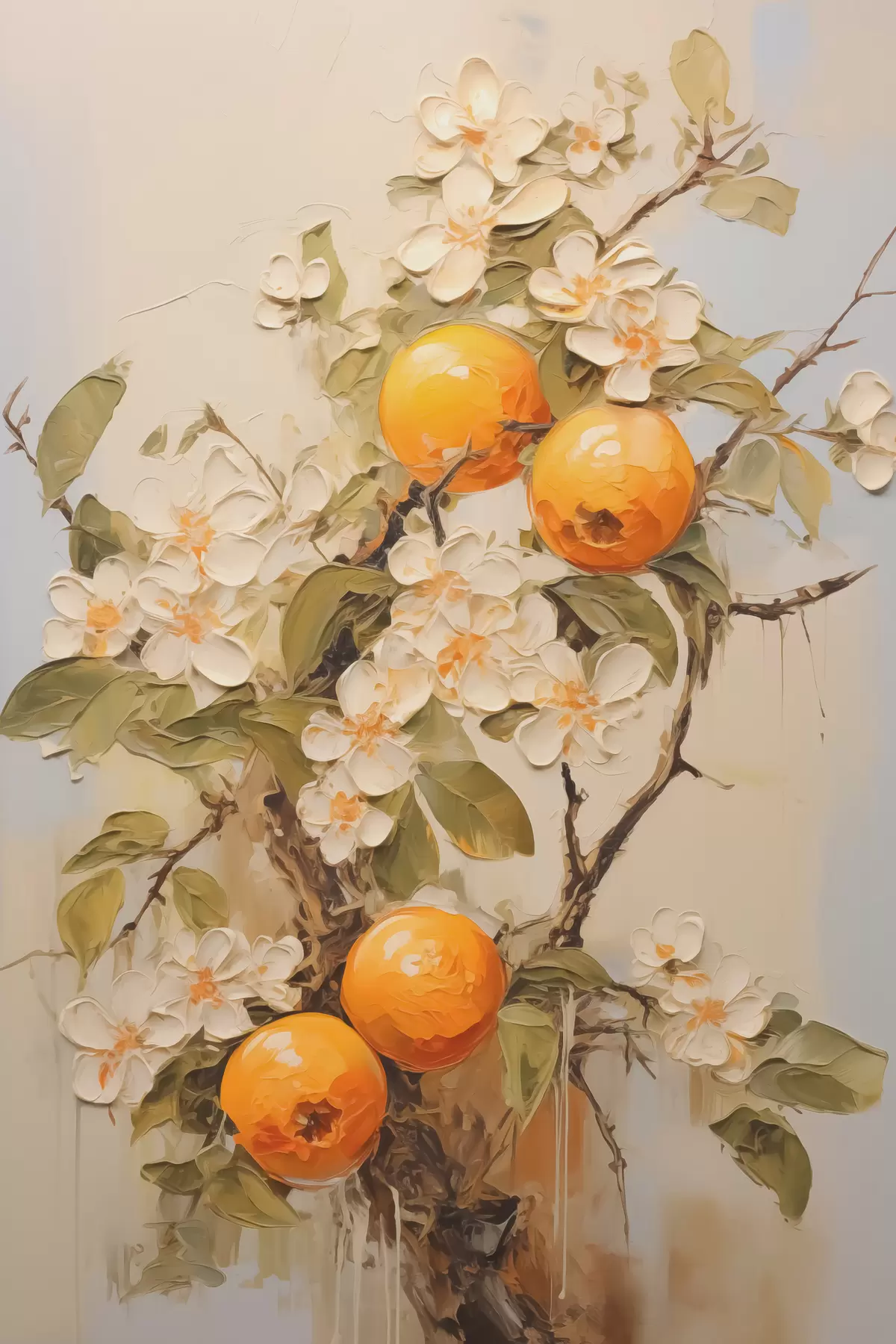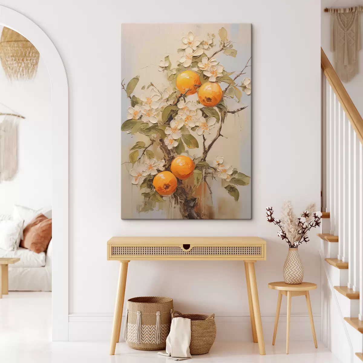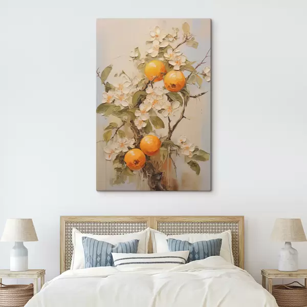 Cuadros Rama con flores blancas y naranjas sobre un fondo gris-beige Nr s40486