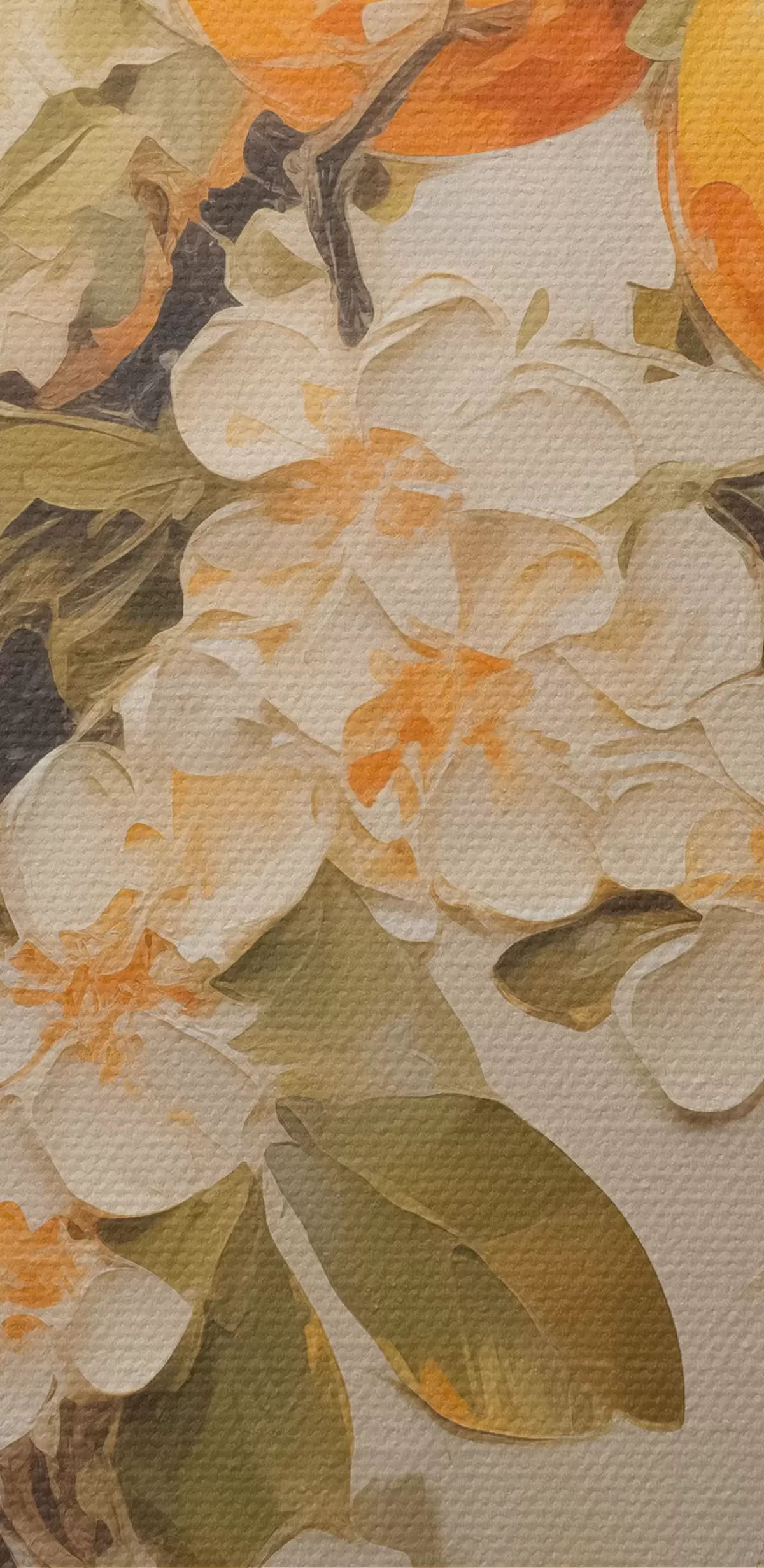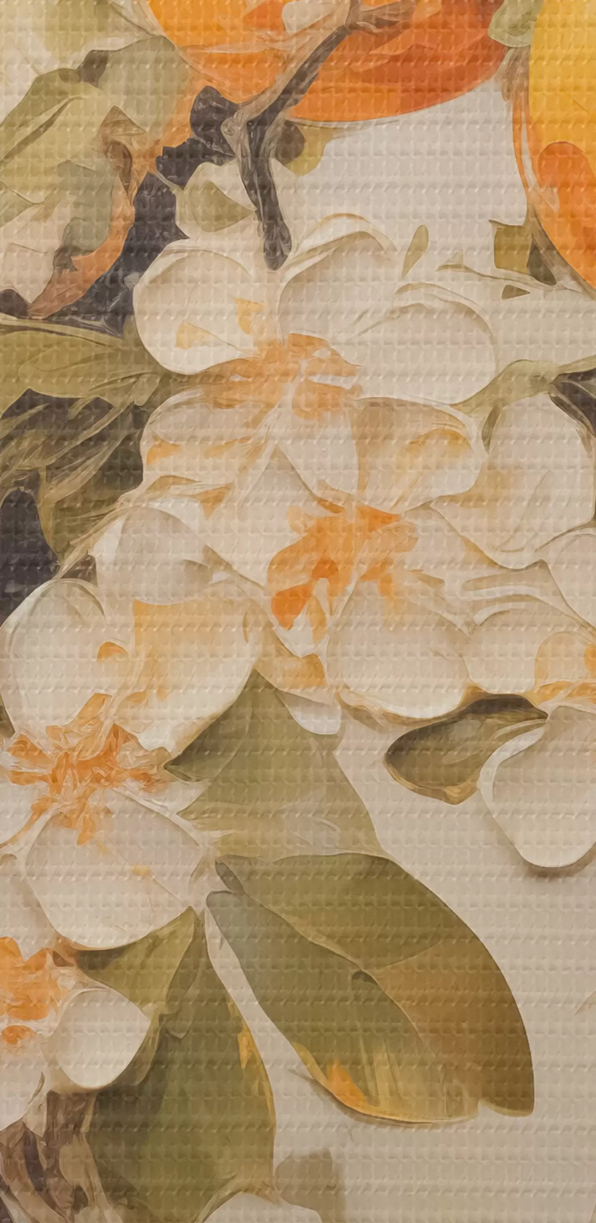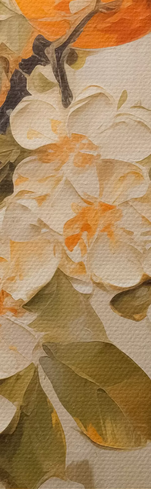 murales de pared Rama con flores blancas y naranjas sobre un fondo gris-beige s40486