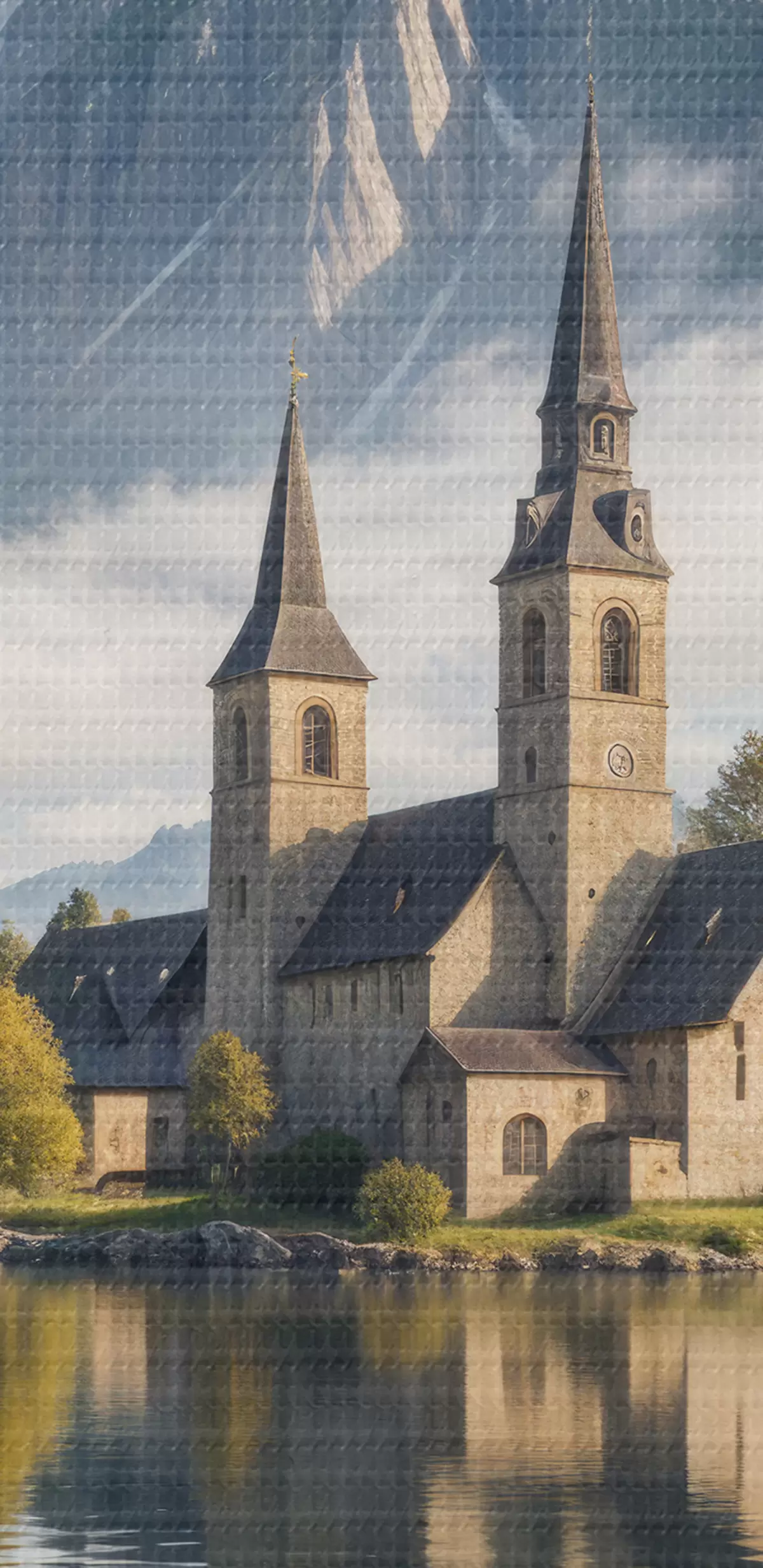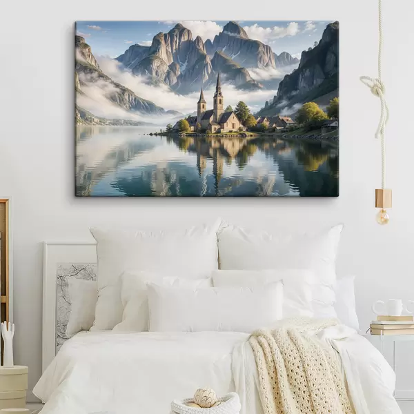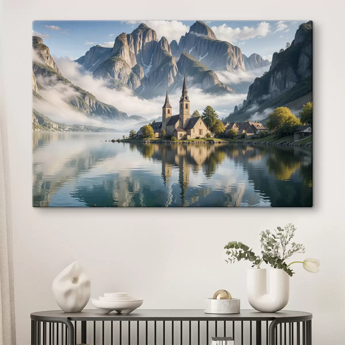 Cuadros Un pintoresco pueblo alpino situado junto a un lago sereno, con imponentes montañas cubiertas de nieve. Nr s40554