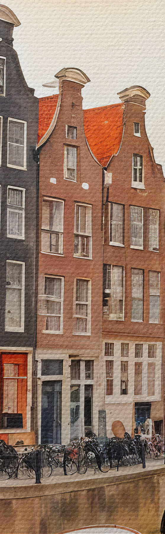 Cuadros Un colorido paisaje urbano de acuarela de Ámsterdam con casas tradicionales de los canales holandeses y barcos en el agua. Nr s40561