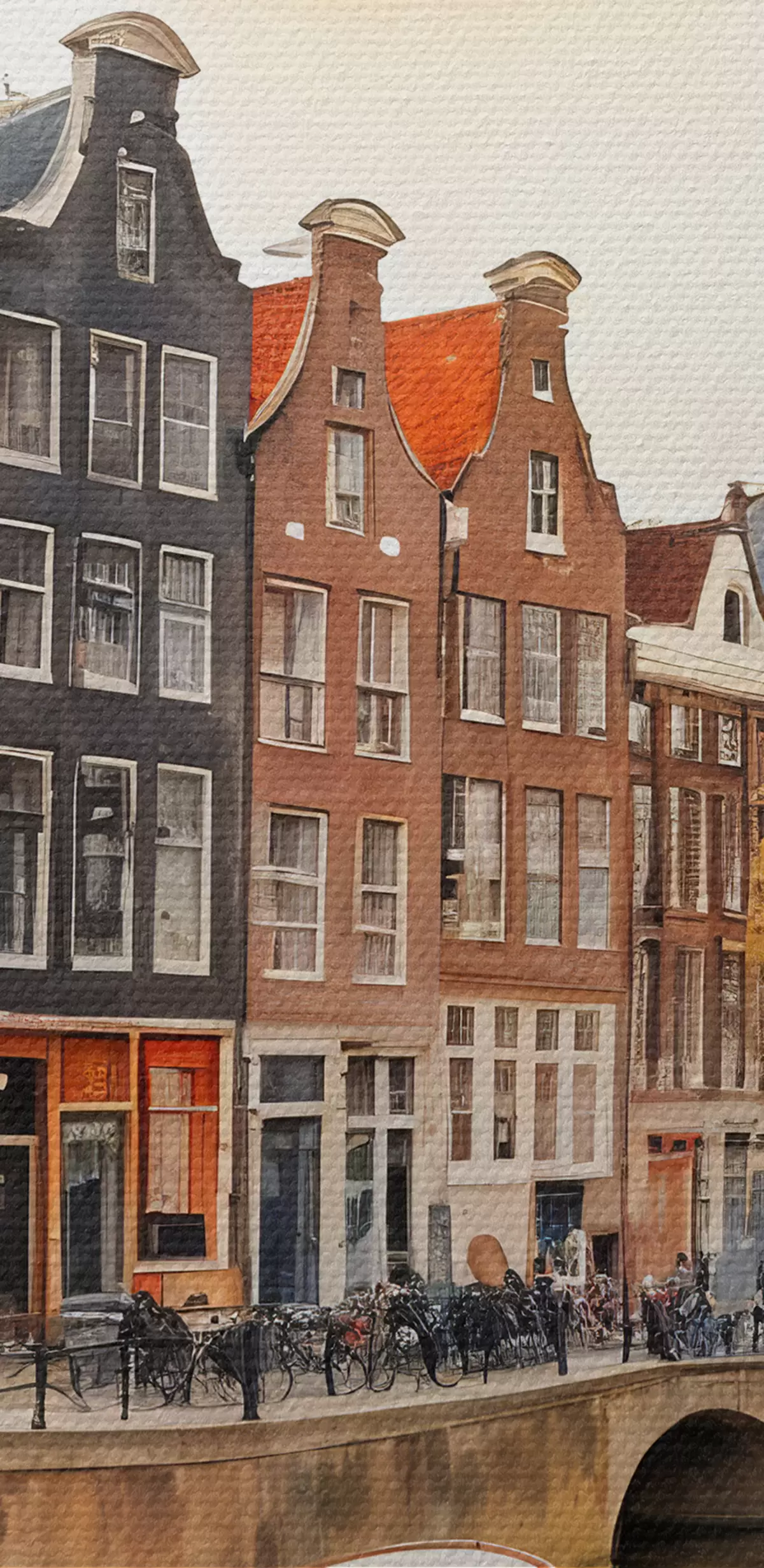 Cuadros Un colorido paisaje urbano de acuarela de Ámsterdam con casas tradicionales de los canales holandeses y barcos en el agua. Nr s40561