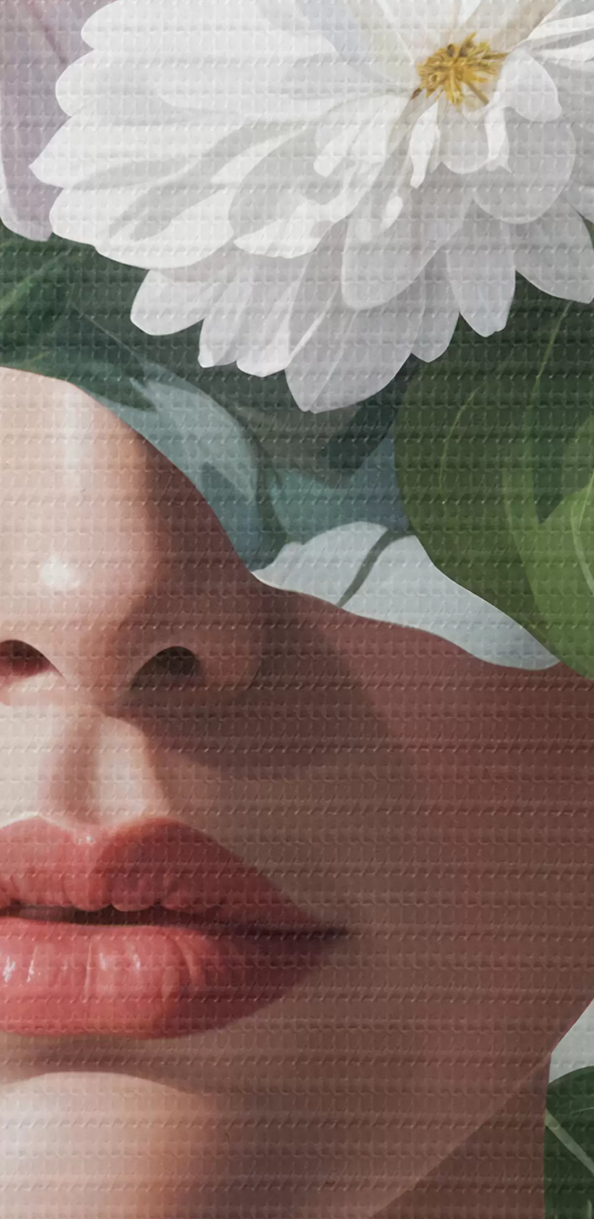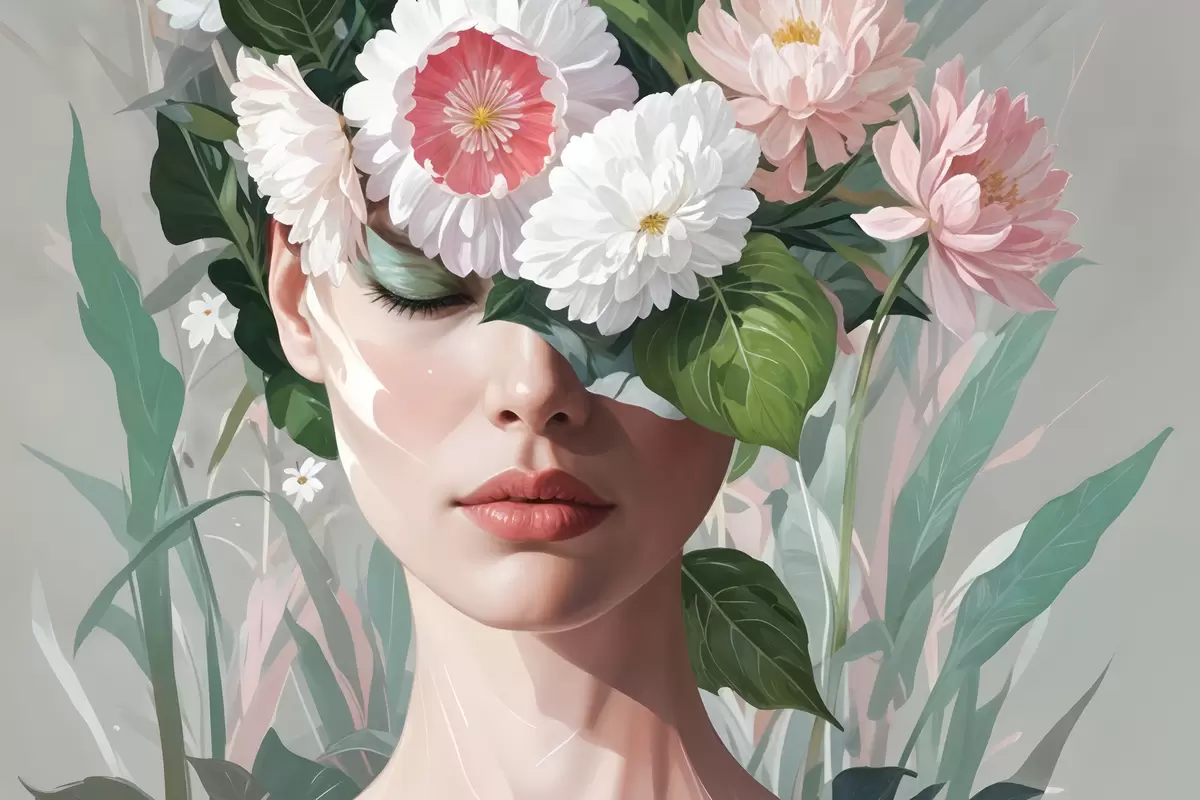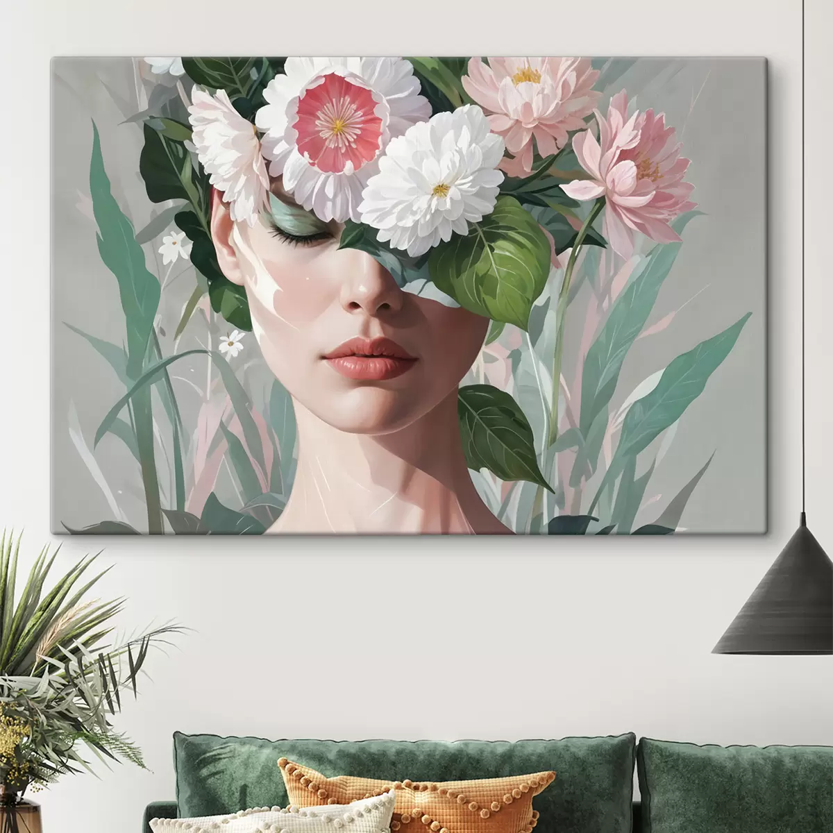 Cuadros Una mujer parcialmente oculta por un ramo de grandes flores rosas y blancas sobre un fondo verde y frondoso. Nr s40567