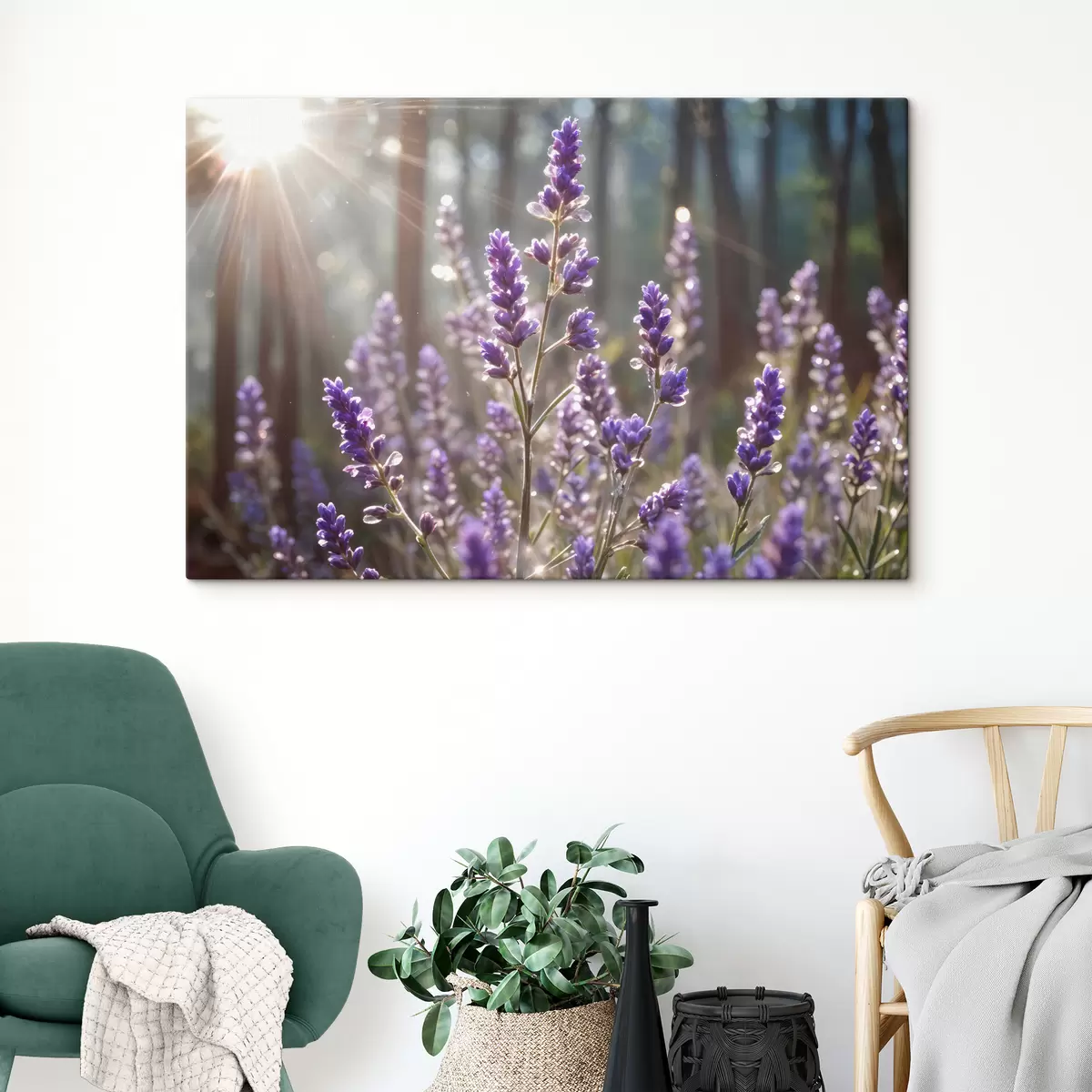Cuadros Flores de lavanda violeta en un campo, con un fondo de bosque borroso y luz solar filtrándose a través de ellas. Nr s40570