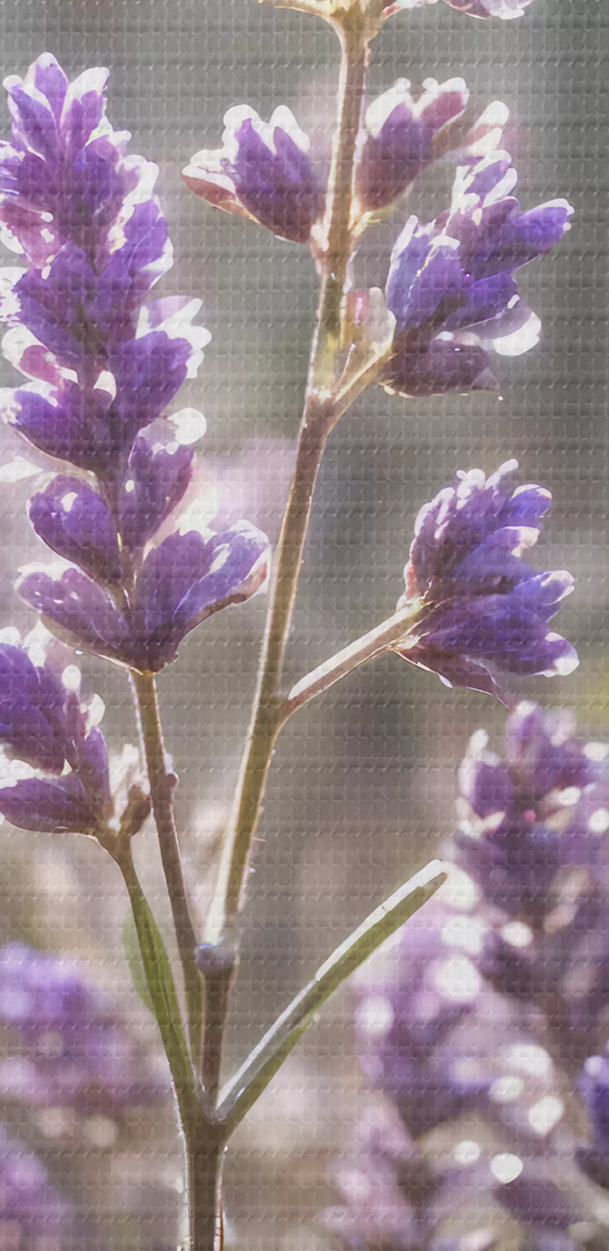 murales de pared Flores de lavanda violeta en un campo, con un fondo de bosque borroso y luz solar filtrándose a través de ellas. s40570