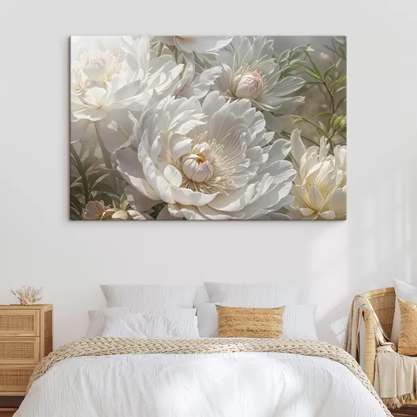 Cuadros Un primer plano de varias flores grandes de peonía blanca con pétalos suaves y delicados y centros de color amarillo pálido. Nr s40575