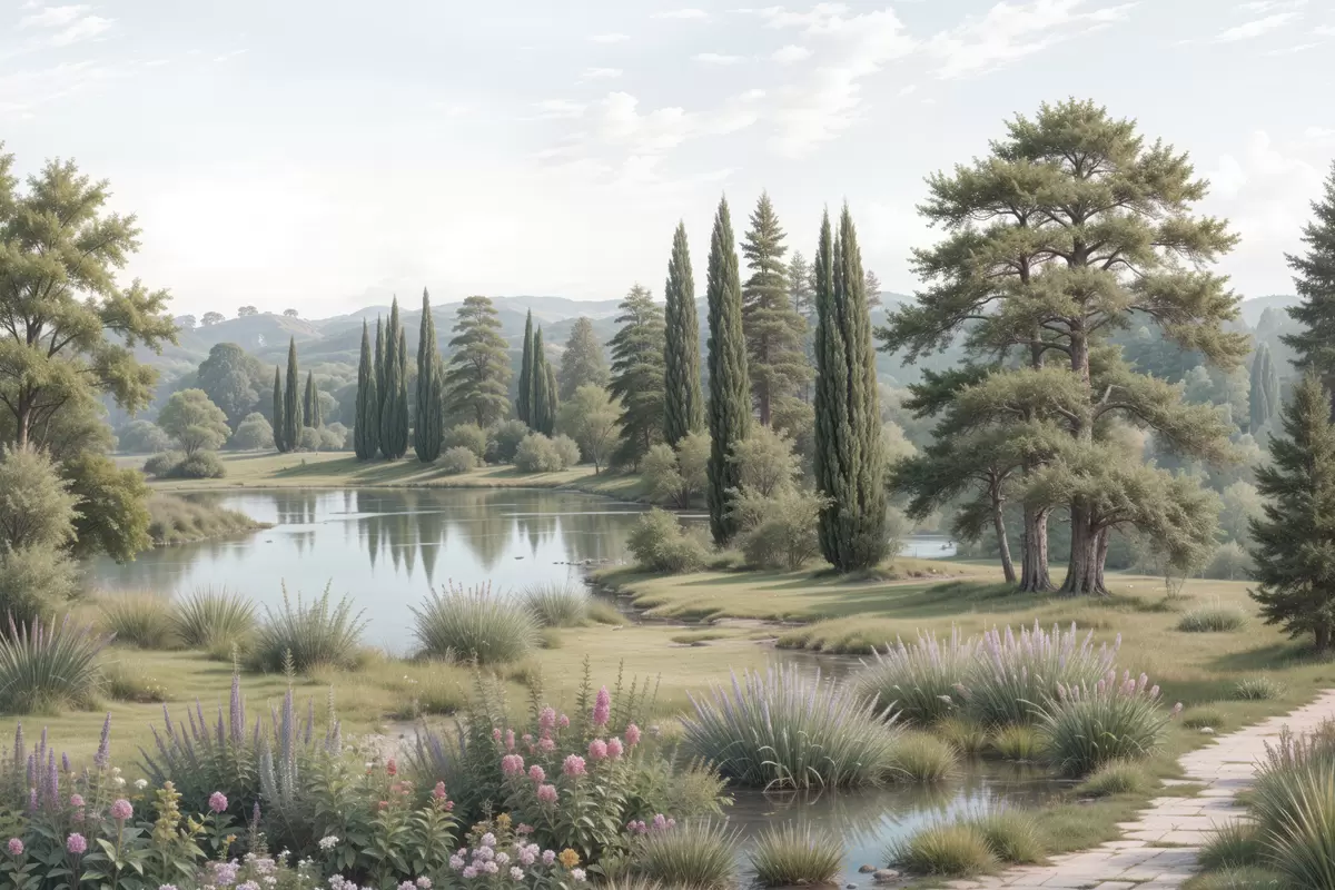 Cuadros Un paisaje sereno con un lago tranquilo rodeado de pinos, cipreses y otra vegetación exuberante. Nr s40579