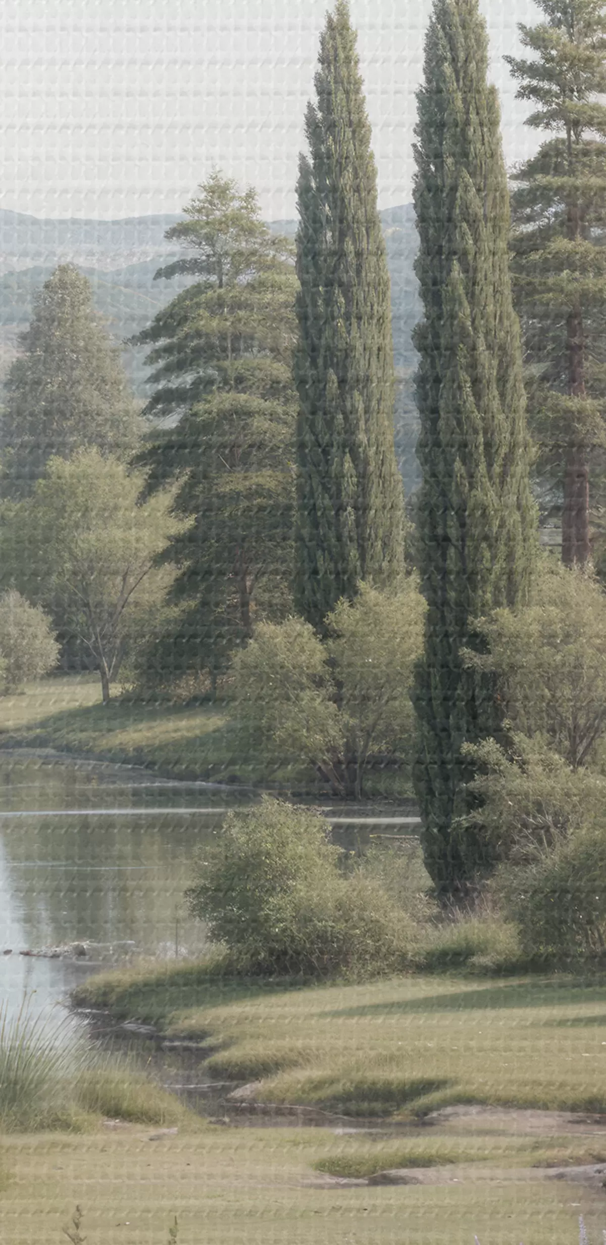 murales de pared Un paisaje sereno con un lago tranquilo rodeado de pinos, cipreses y otra vegetación exuberante. s40579