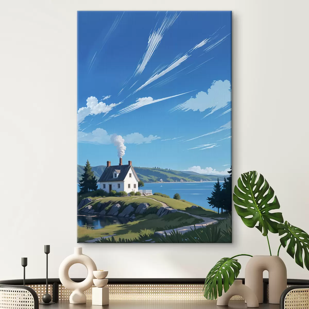 Cuadros Una casa blanca en una colina cubierta de hierba con montañas al fondo y un cielo azul con nubes difusas Nr s40587