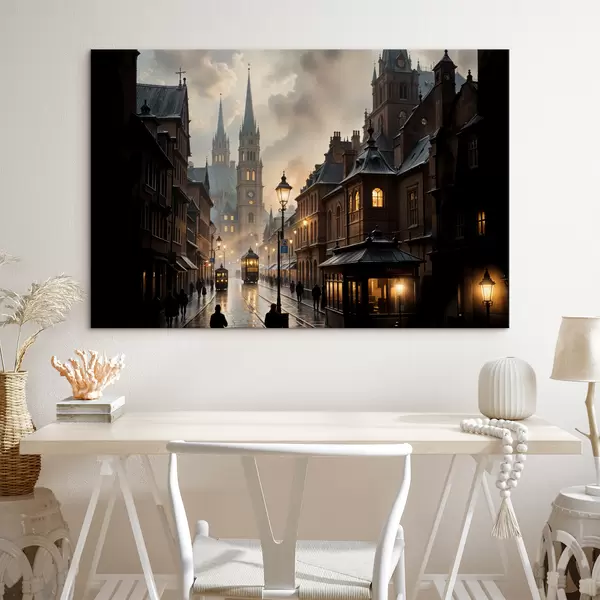 Cuadros Una tarde lluviosa en una vieja ciudad europea, con calles adoquinadas, edificios históricos y un tranvía que pasa por delante Nr s40604