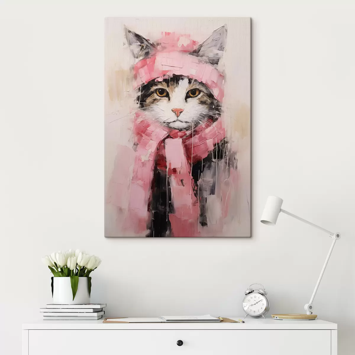 Cuadros Gato negro gris con gorro y bufanda rosa Nr s40801