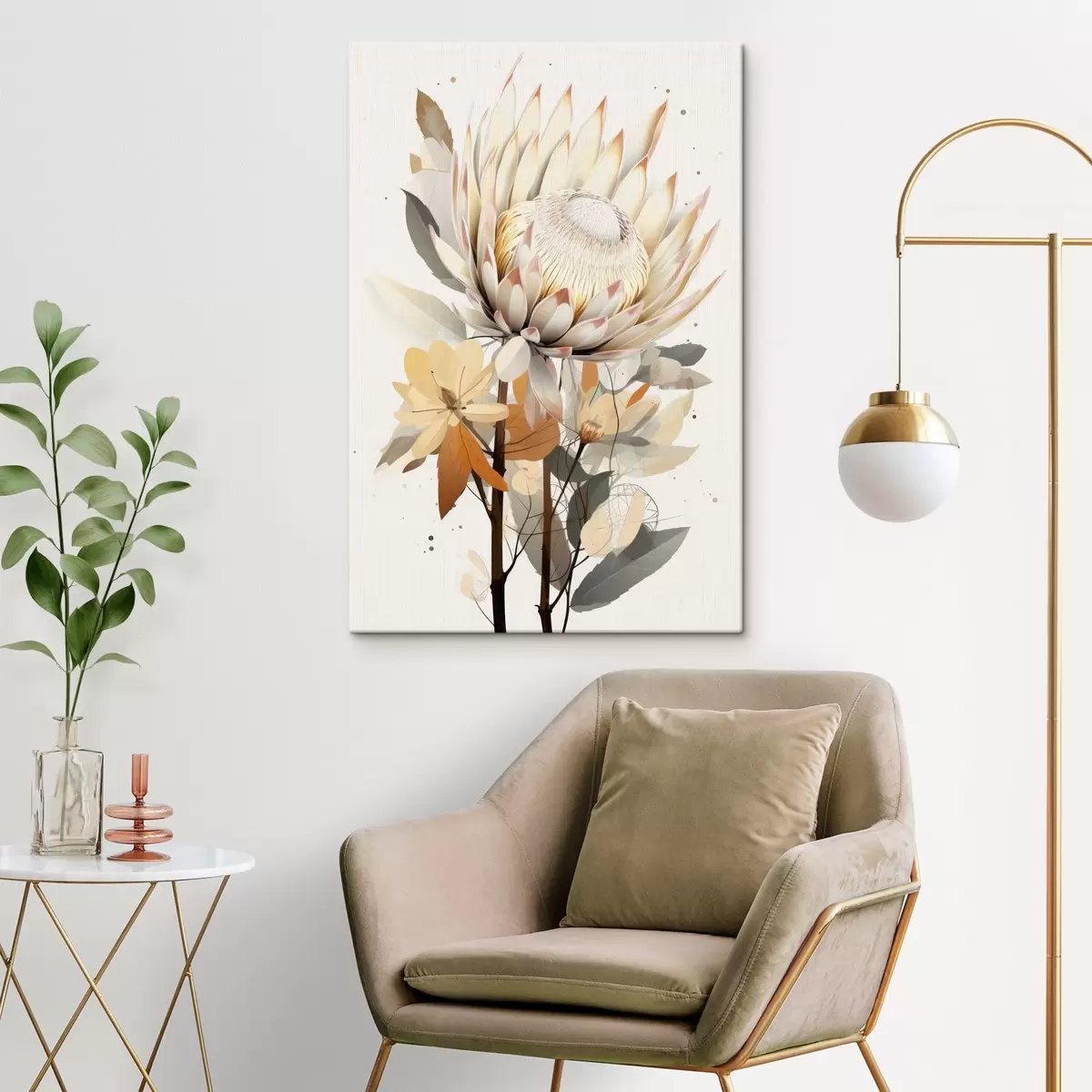 Cuadros Hermosas flores de protea con exuberantes hojas, suaves colores beige, algodón Nr s40817
