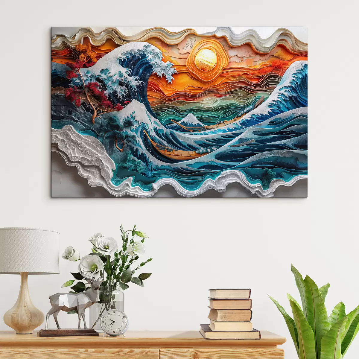 Cuadros Imitación de bajorrelieve: un océano embravecido con barcos y el sol Nr s40976