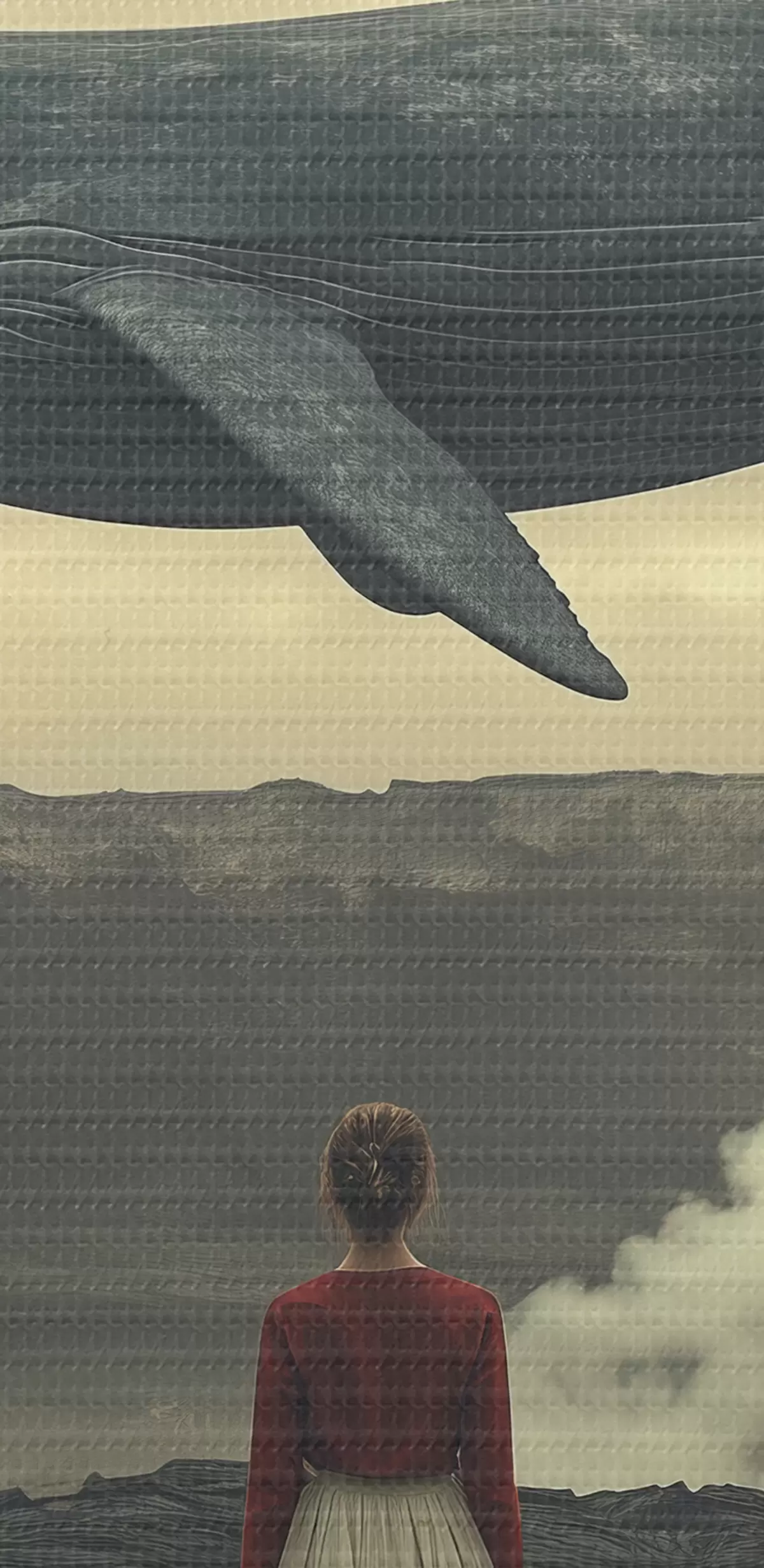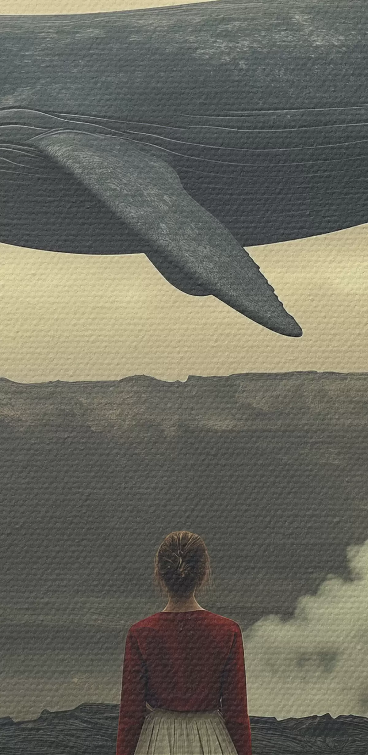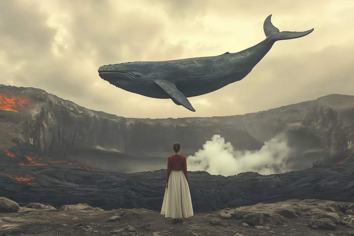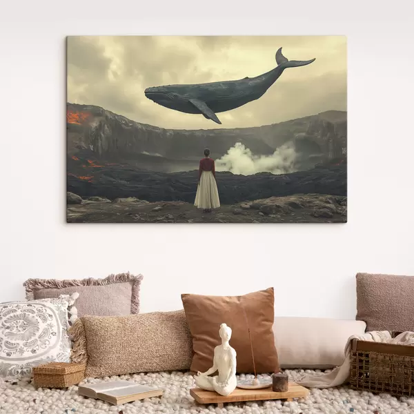 Cuadros Chica sobre lava con una gran ballena voladora en el cielo Nr s40986