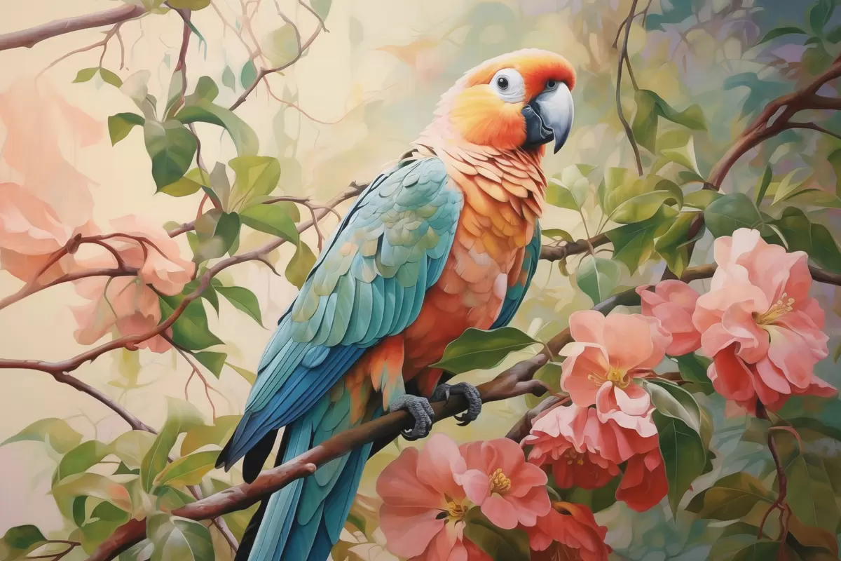 Cuadros Guacamayo sentado en una rama con flores rosas Nr s41018