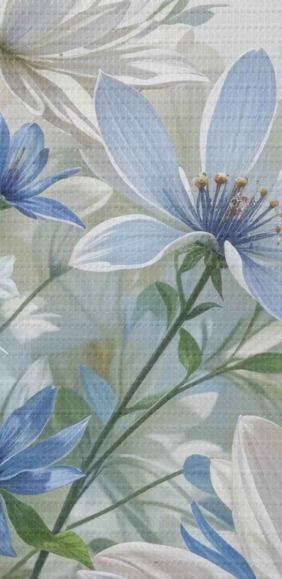 murales de pared Un campo de flores blancas y azules parecidas a margaritas con hojas y tallos verdes sobre un fondo suave y difuminado s41086