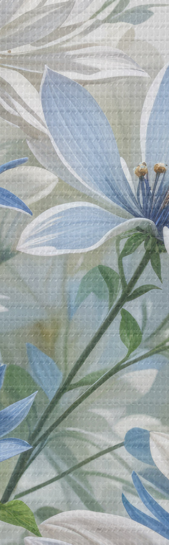 Cuadros Un campo de flores blancas y azules parecidas a margaritas con hojas y tallos verdes sobre un fondo suave y difuminado Nr s41086