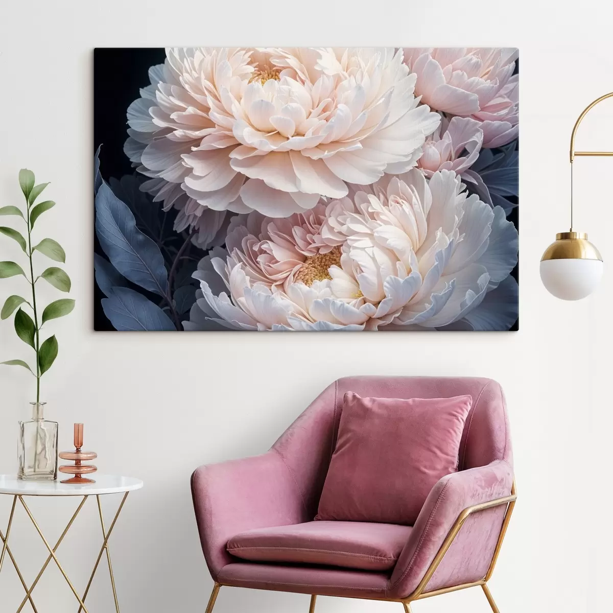Cuadros Delicadas peonías rosa pastel con suaves y esponjosos pétalos y hojas azules sobre un fondo oscuro Nr s41092