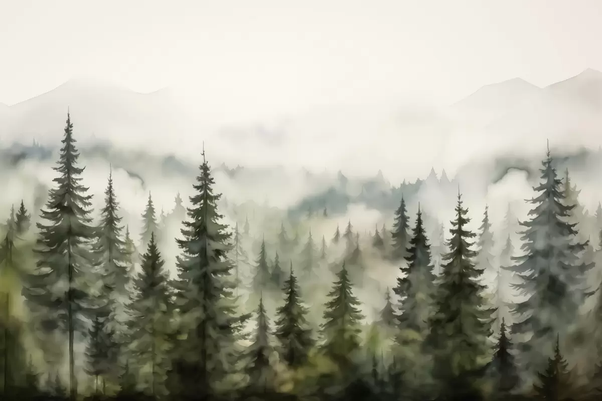 murales de pared Bosque verde sobre el fondo de montañas montañas y niebla acuarela s41241