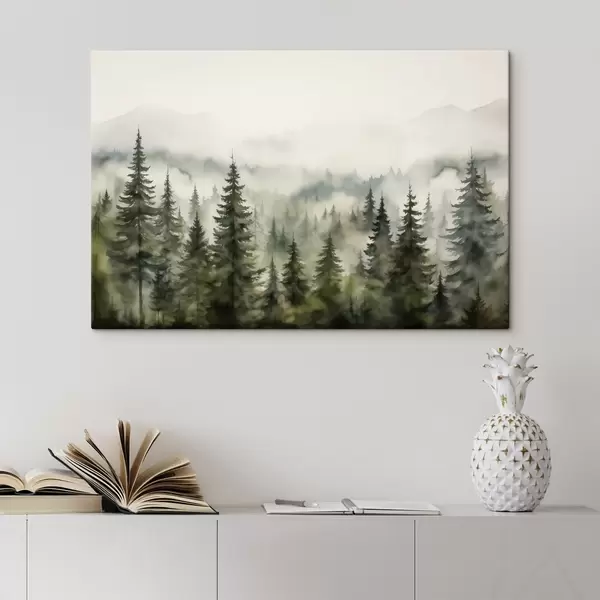 Cuadros Bosque verde sobre el fondo de montañas montañas y niebla acuarela Nr s41241