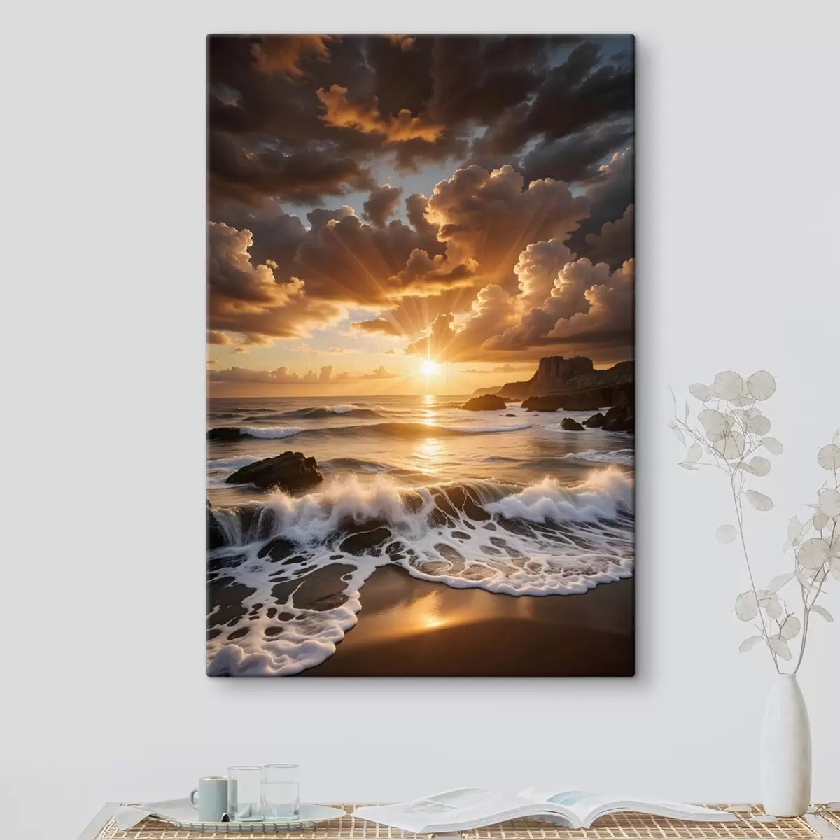 Cuadros Una dramática puesta de sol sobre una costa rocosa, con olas rompiendo y espectaculares nubes en el cielo Nr s41245