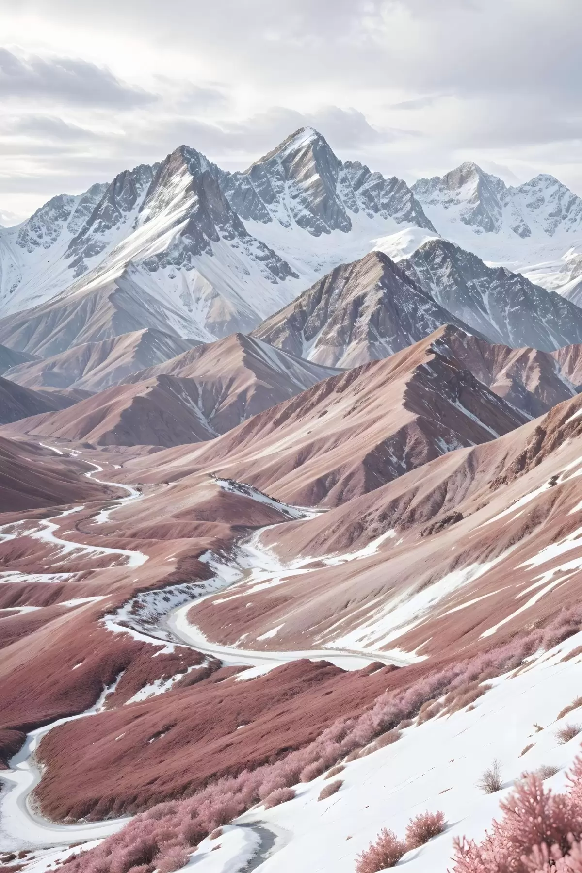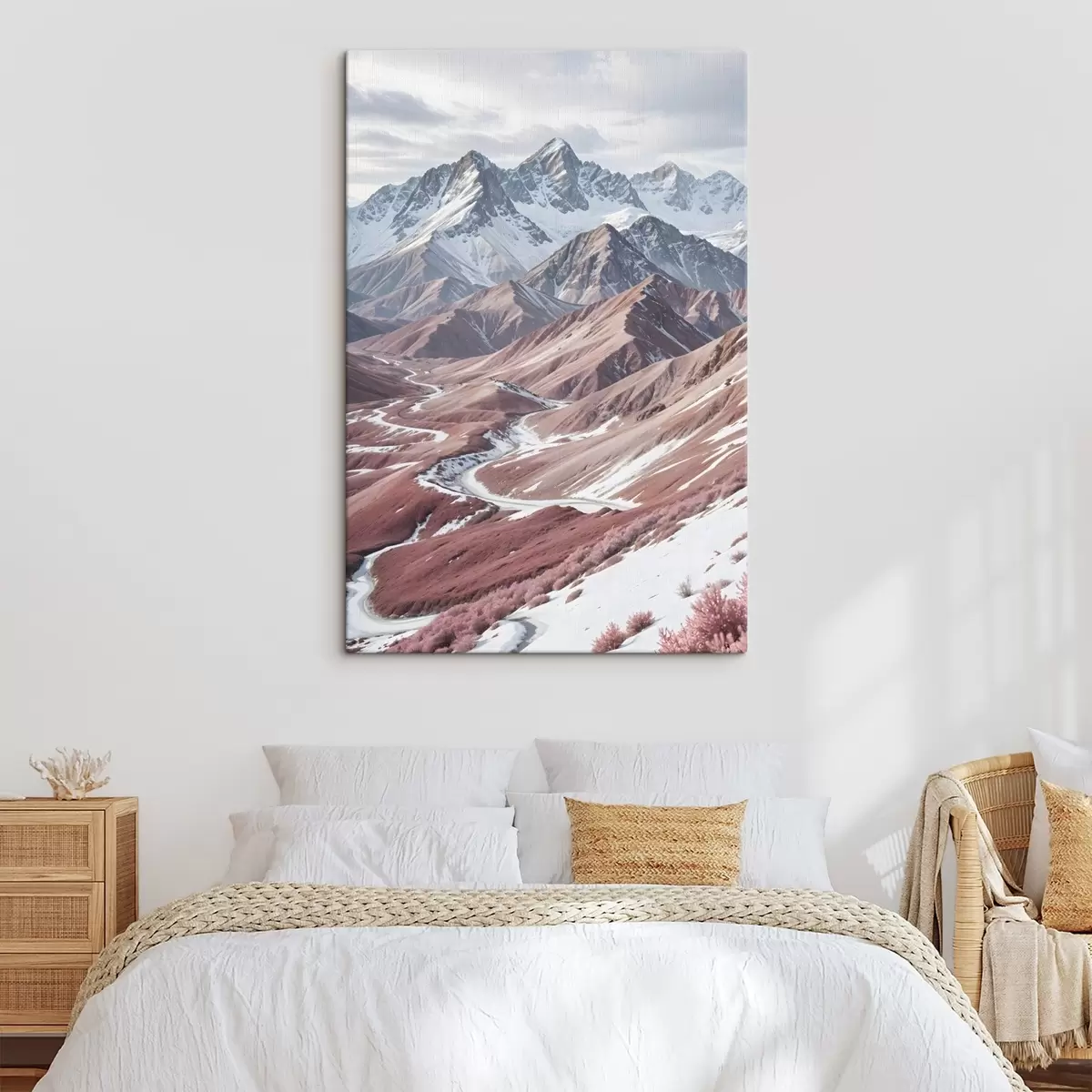 Cuadros Montañas escarpadas cubiertas de nieve con un río serpenteante que fluye a través de un paisaje vasto y colorido Nr s41262