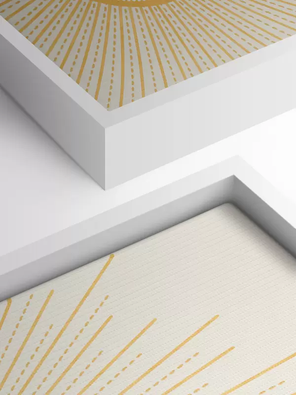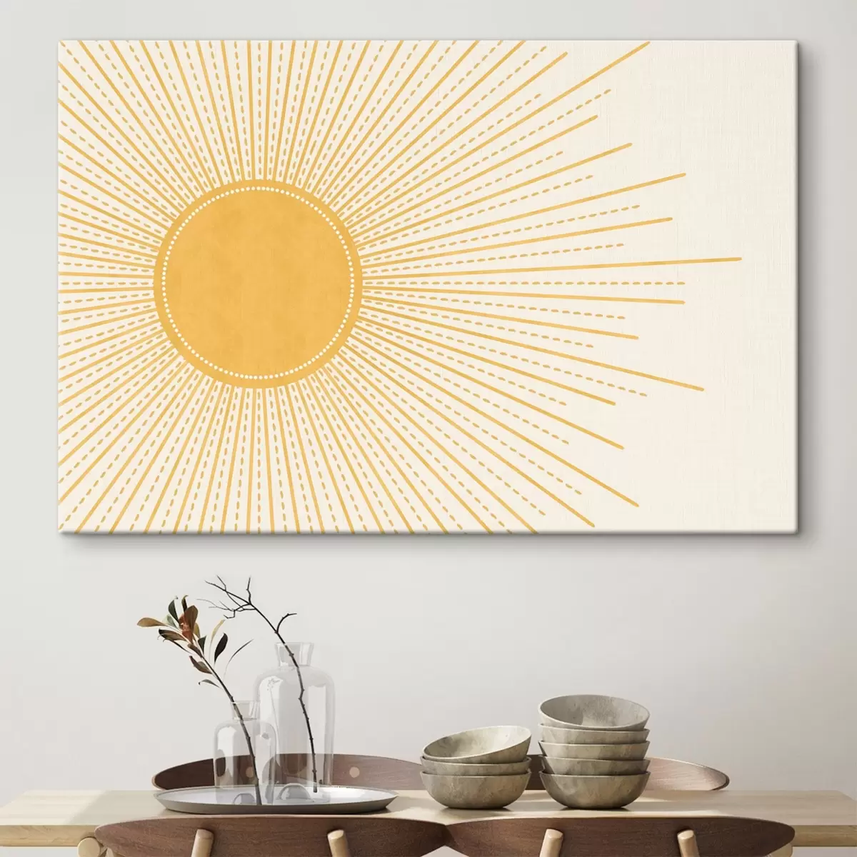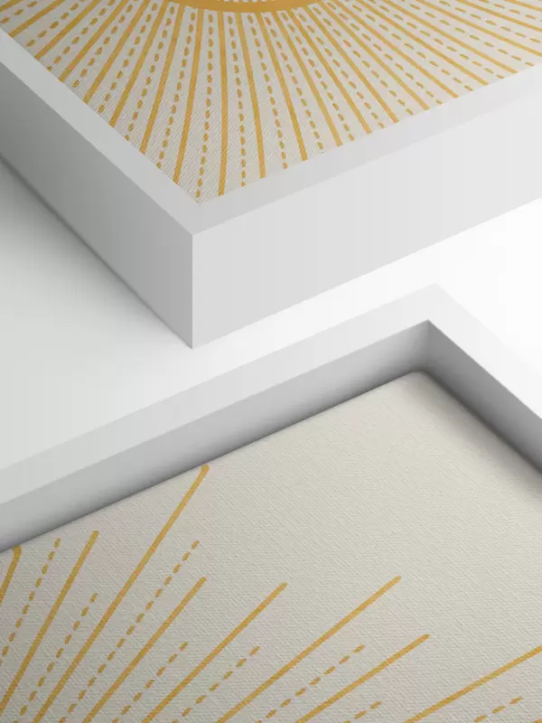 Cuadros Un sol amarillo brillante que irradia rayos de sol sobre un fondo claro, creando un ambiente cálido y soleado Nr s41268