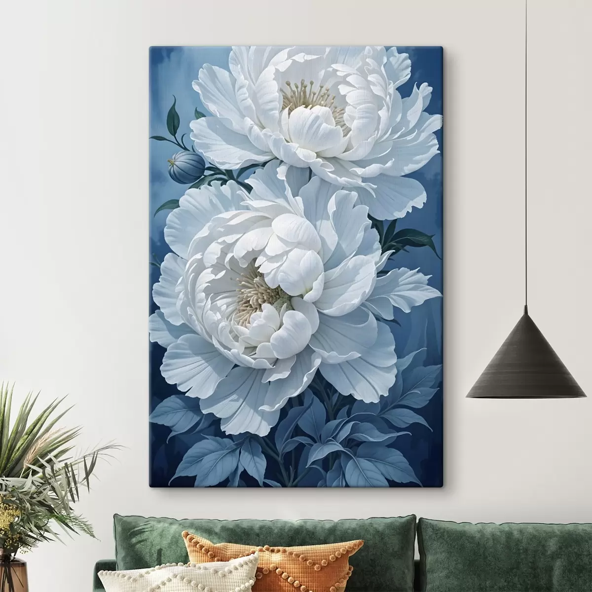 Cuadros Peonías blancas con hojas verdes sobre fondo azul oscuro Nr s41270