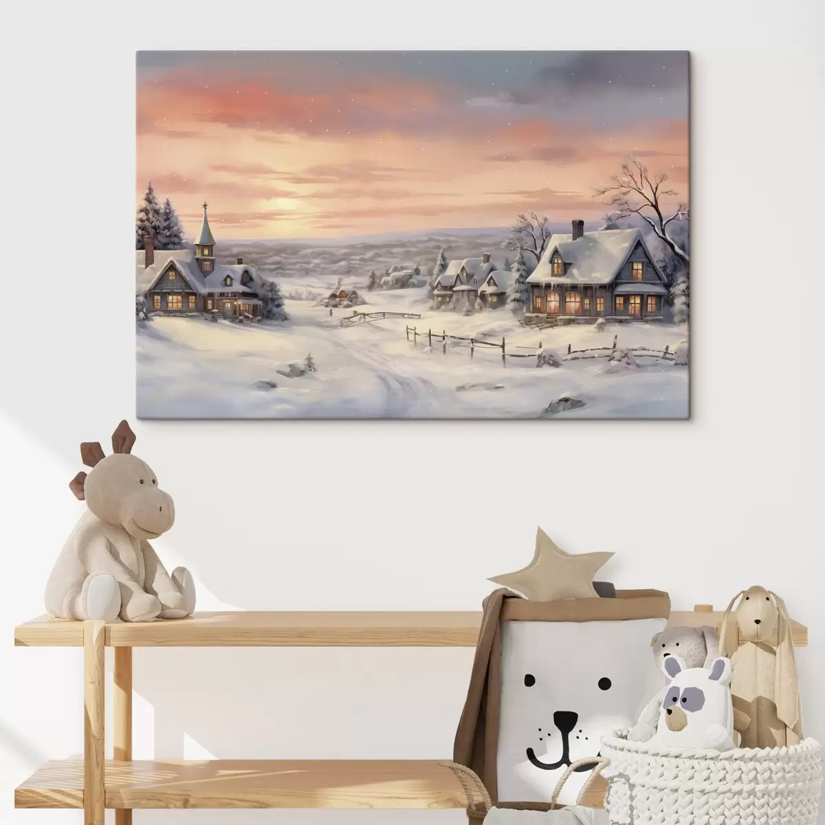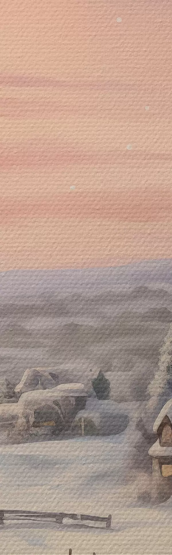 Cuadros Puesta de sol en el pueblo de invierno, rústico, acuarela, copos de nieve Nr s41386