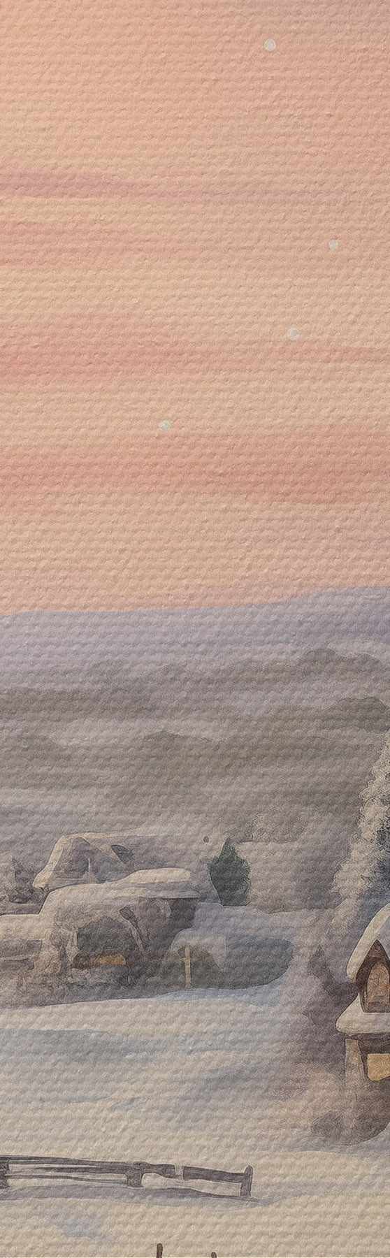 murales de pared Puesta de sol en el pueblo de invierno, rústico, acuarela, copos de nieve s41386
