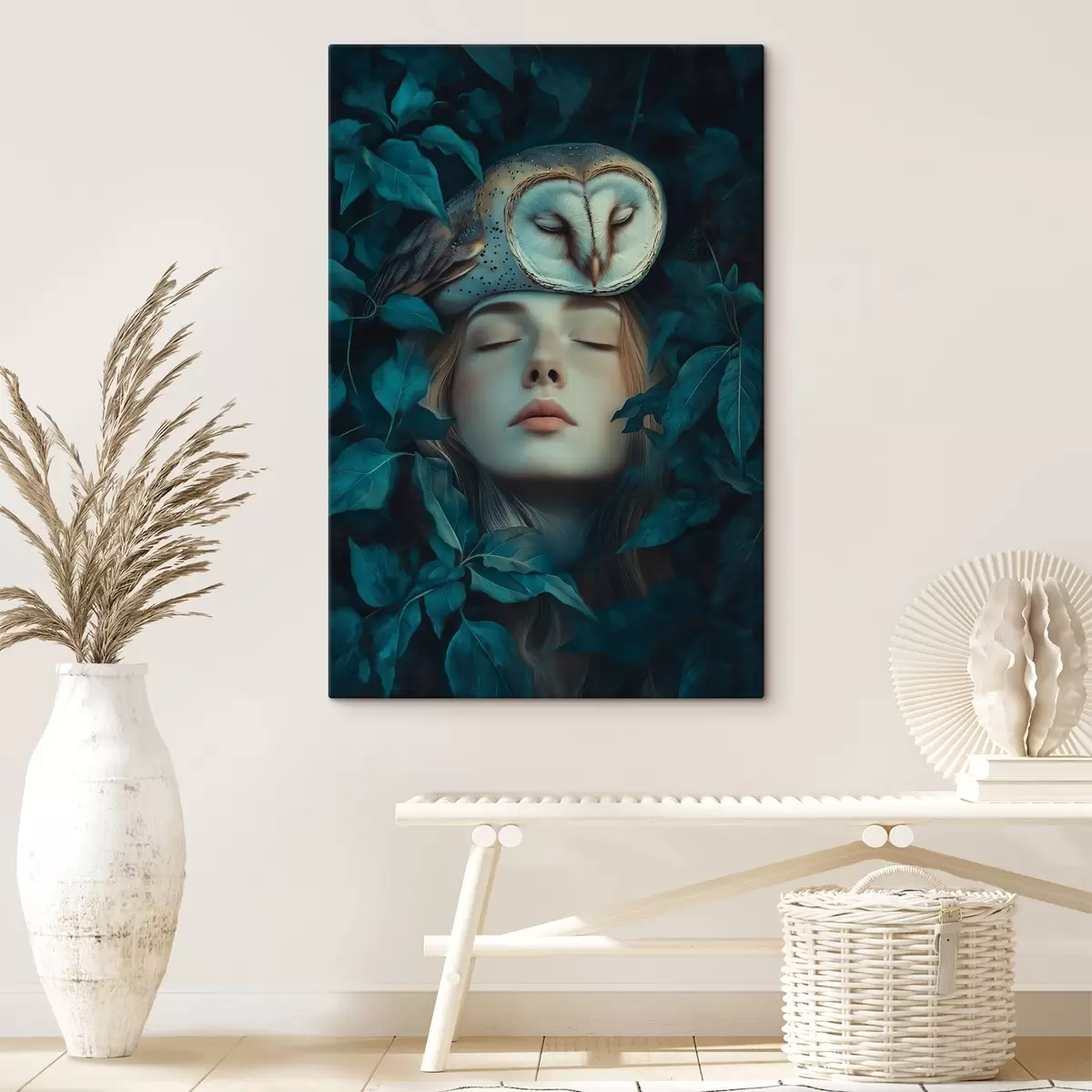 Cuadros Mujer con búho en las hojas verdes, tranquilo, naturaleza Nr s41445