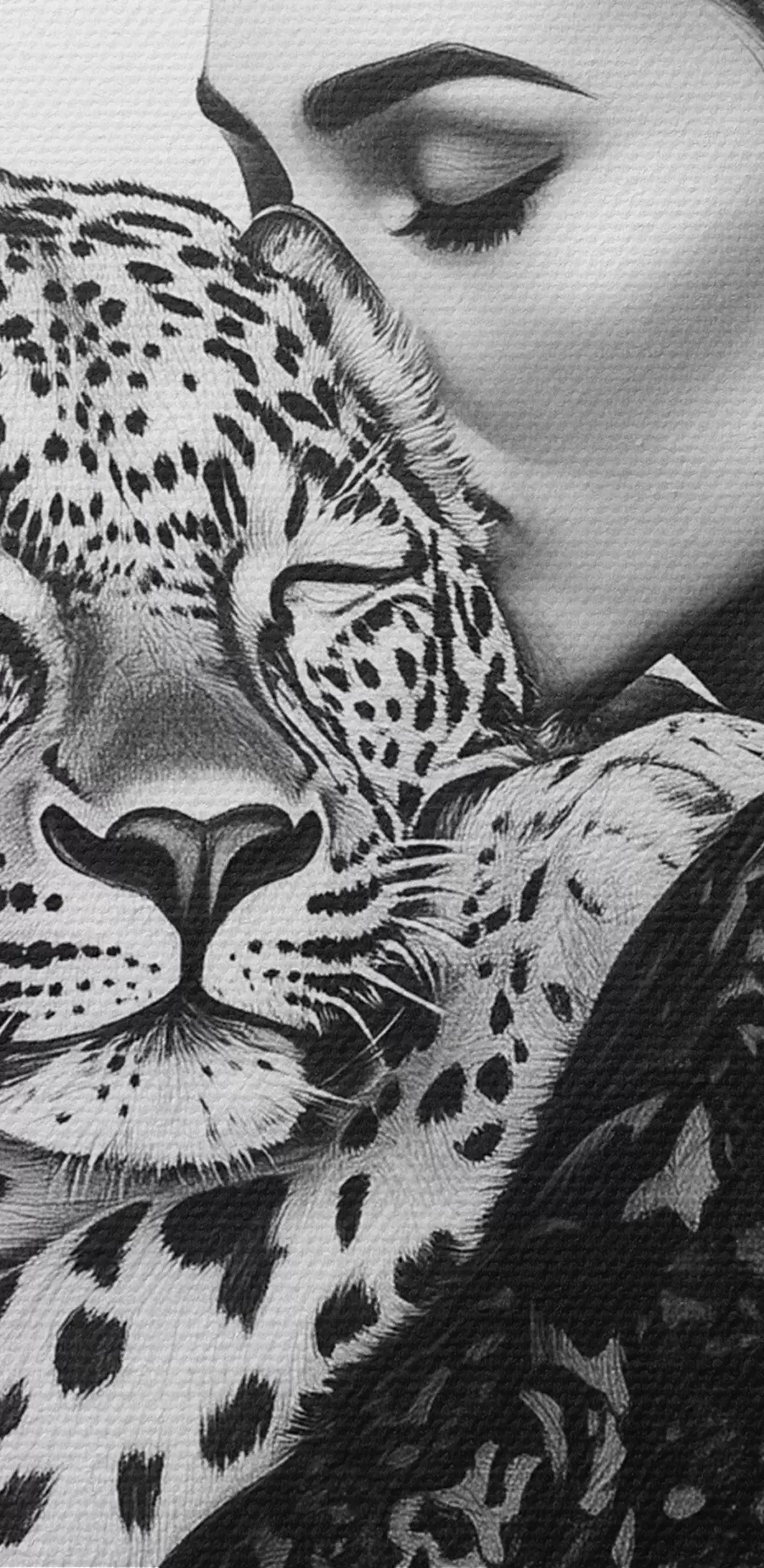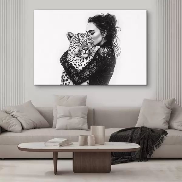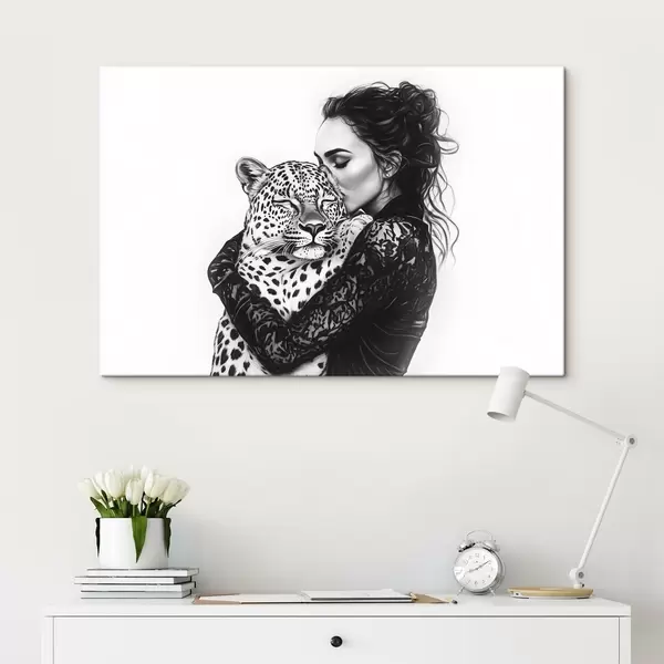 Cuadros Mujer besando leopardo, dibujo a lápiz, animales salvajes, blanco y negro Nr s41457