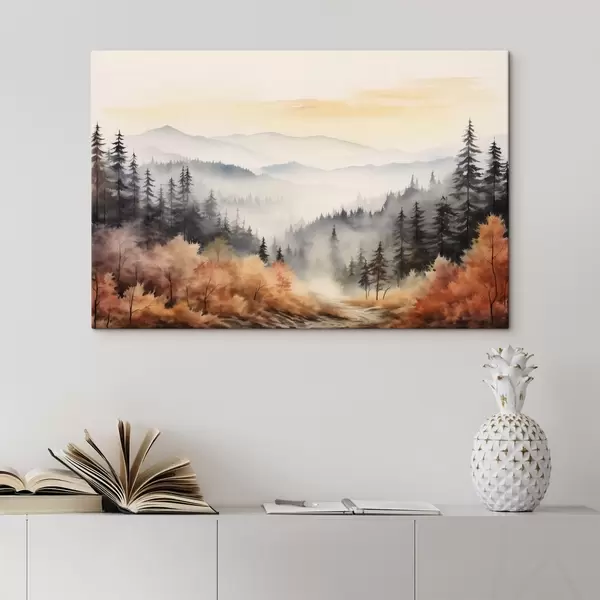Cuadros Hermosas montañas de niebla, bosque de otoño, acuarela Nr s41646