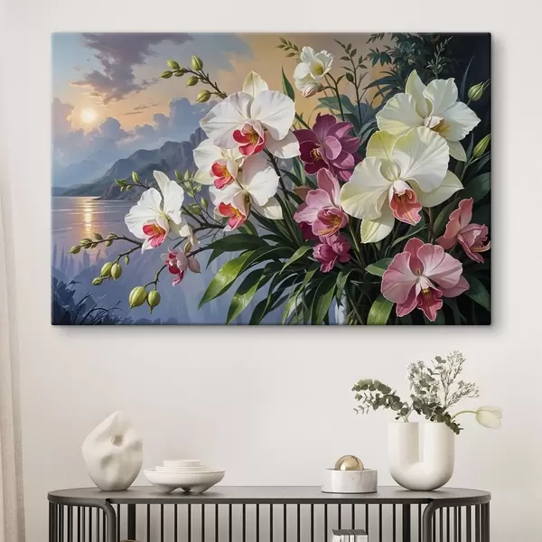 Cuadros Un vibrante ramo de flores tropicales con orquídeas y exuberante follaje verde sobre un fondo de paisaje marino Nr s41713