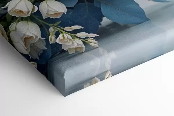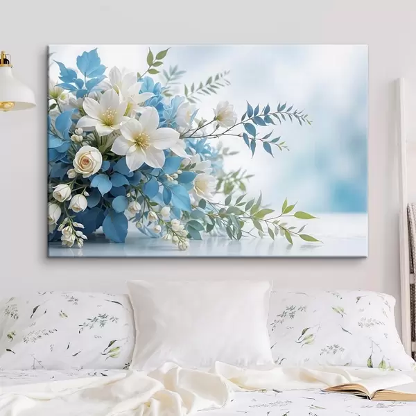 Cuadros Un ramo de flores blancas y azules con hojas verdes sobre un fondo suave y difuminado Nr s41715
